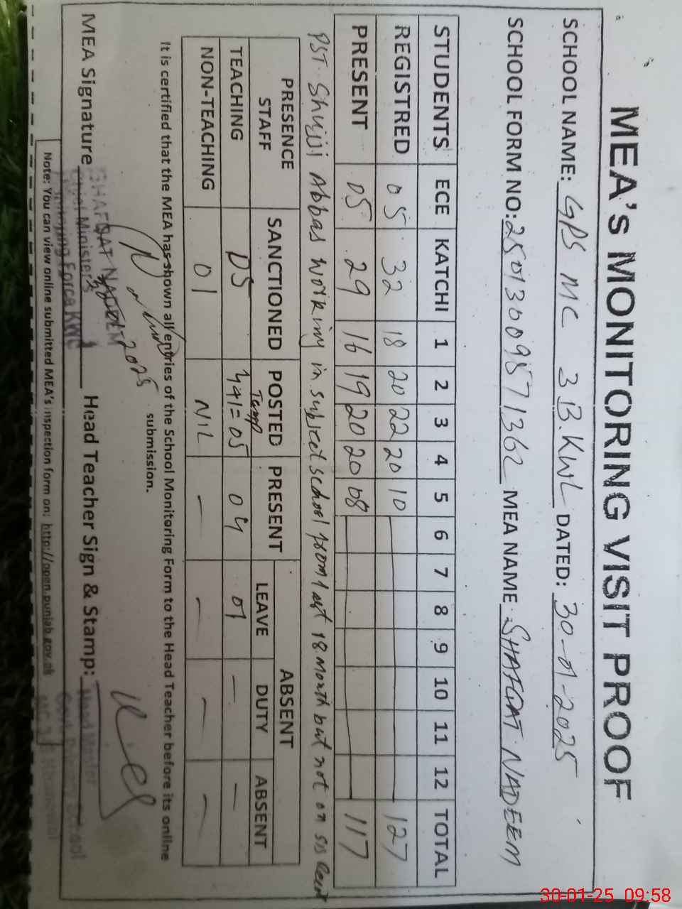 | Attendance Register | Head Teacher | MEA with School | Visit Proof |