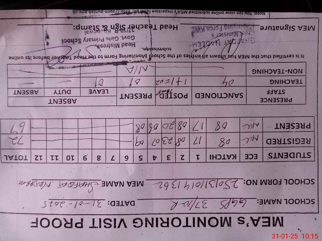 | Attendance Register | Head Teacher | MEA with School | Visit Proof |