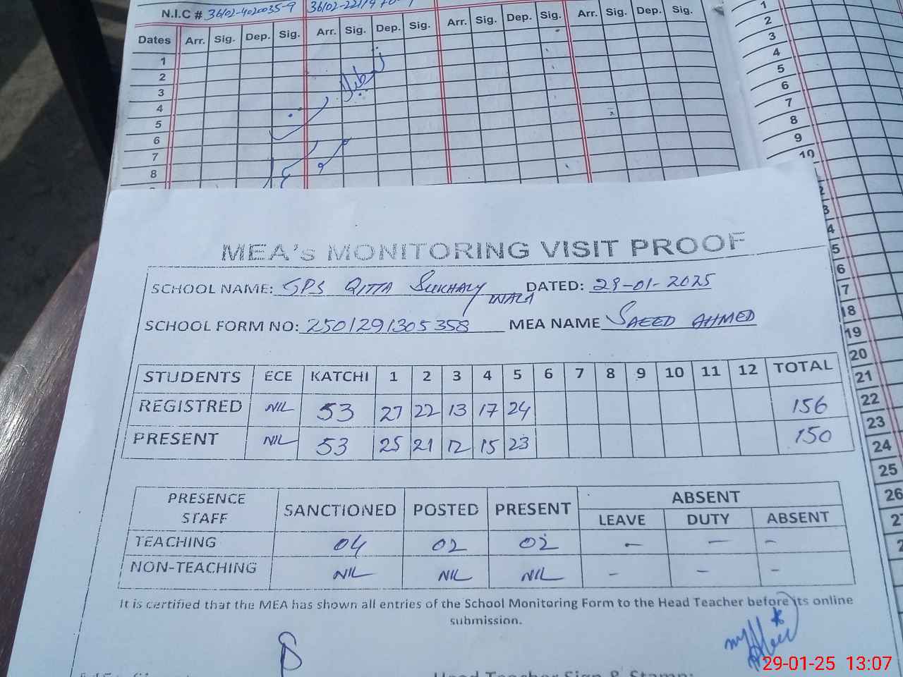 | Attendance Register | Head Teacher | MEA with School | Visit Proof |