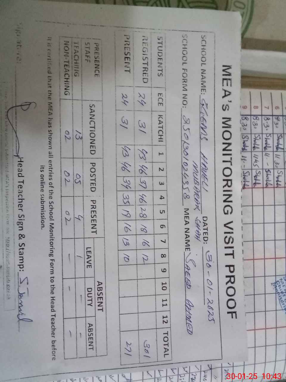 | Attendance Register | Head Teacher | MEA with School | Visit Proof |