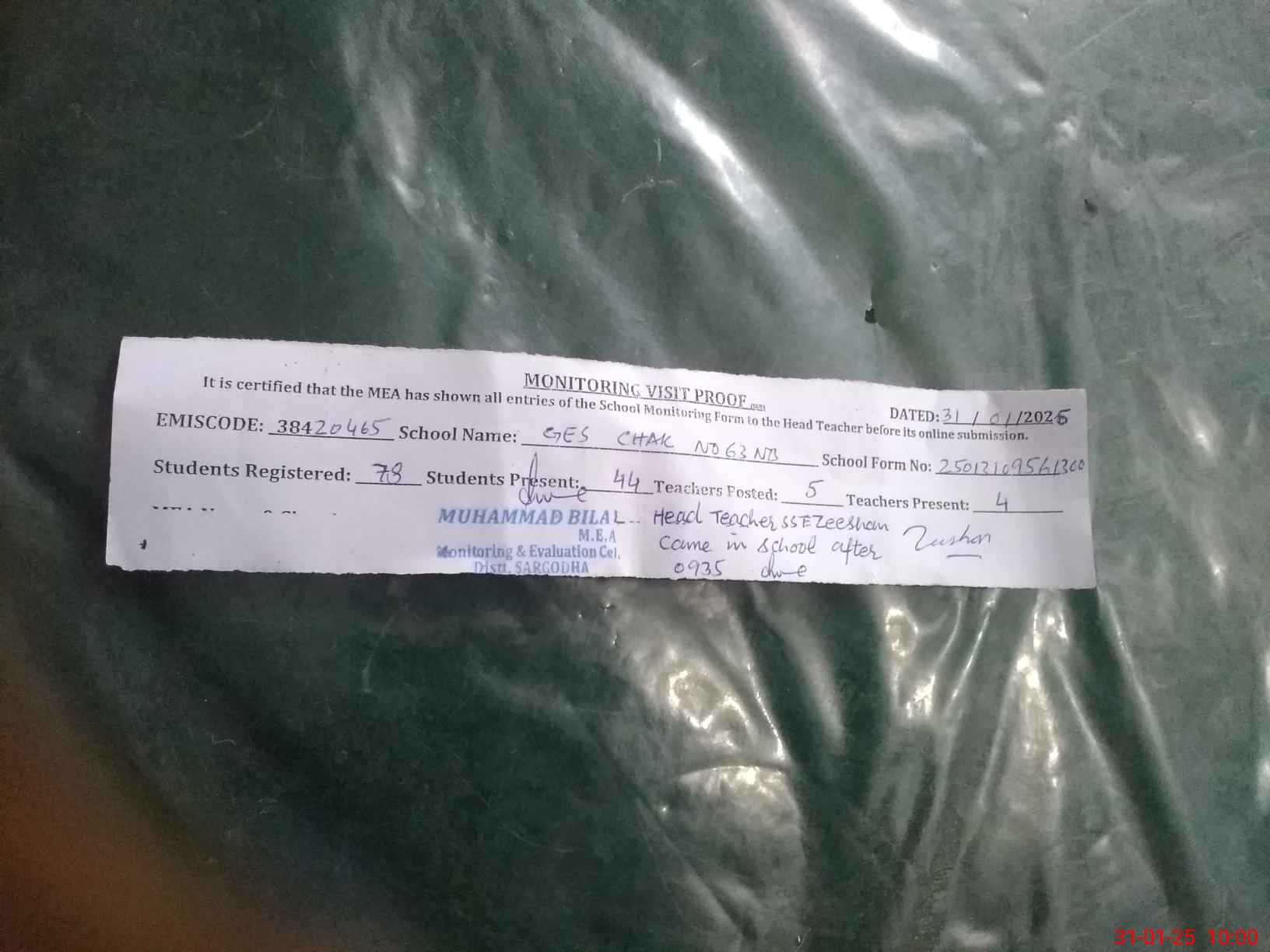 | Attendance Register | Head Teacher | MEA with School | Visit Proof |