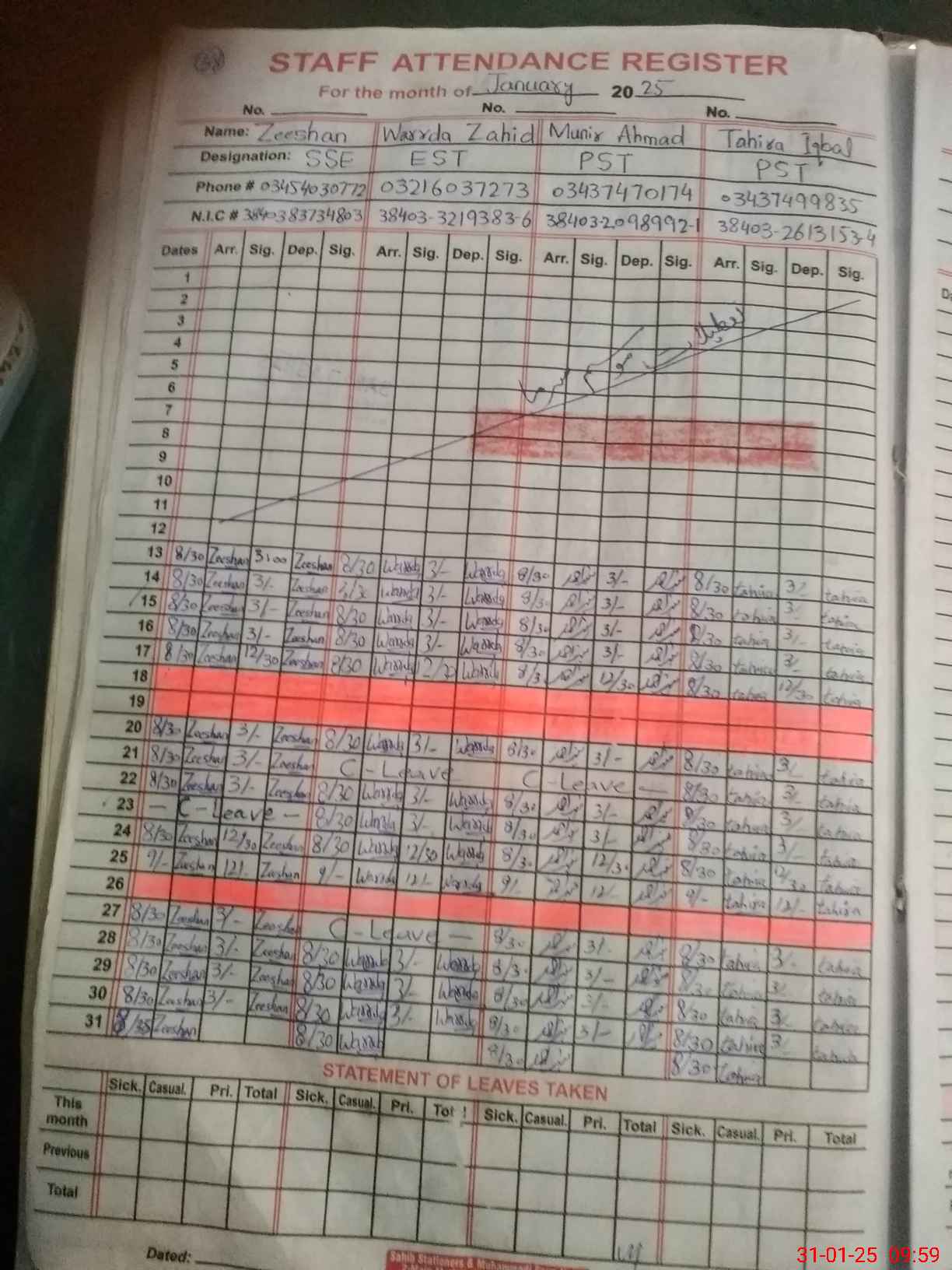 | CNIC | Full Name | Designation | R/C | Absence during last cal. month |