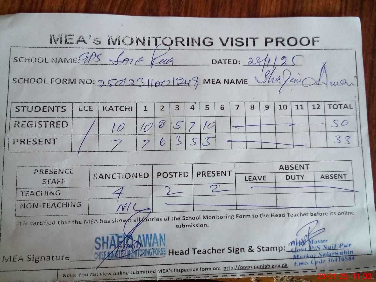 | Attendance Register | Head Teacher | MEA with School | Visit Proof |
