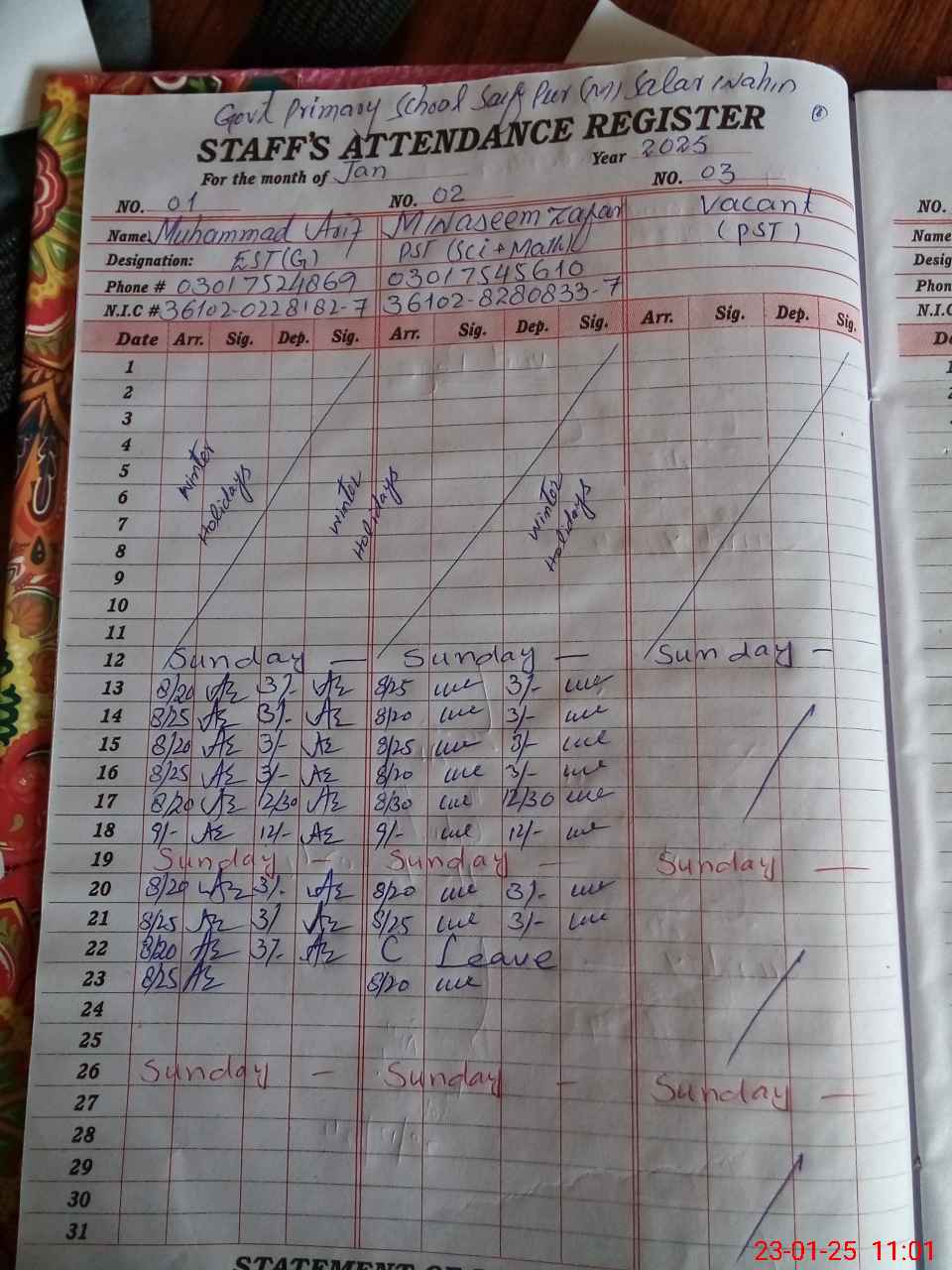 | CNIC | Full Name | Designation | R/C | Absence during last cal. month |