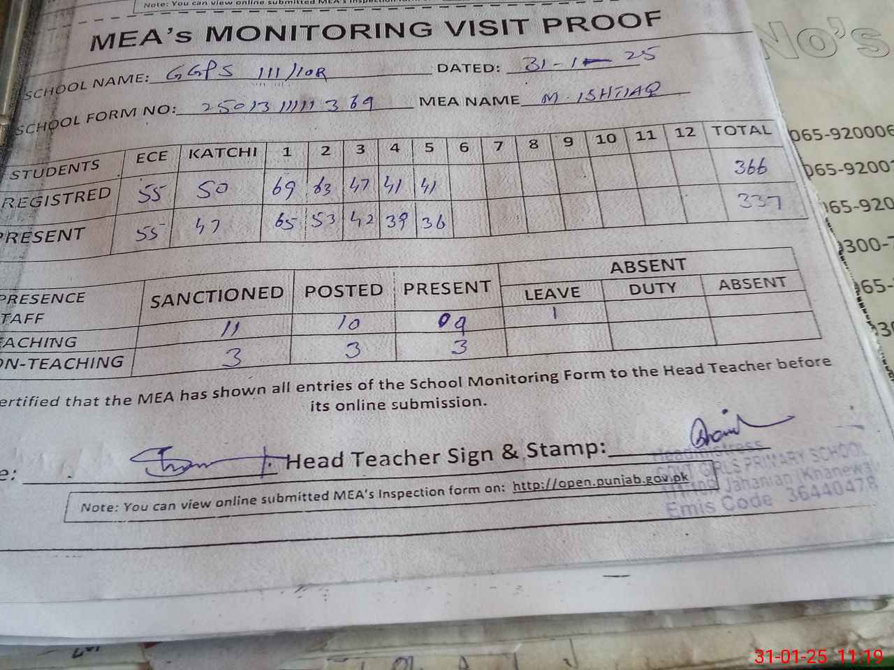 | Attendance Register | Head Teacher | MEA with School | Visit Proof |