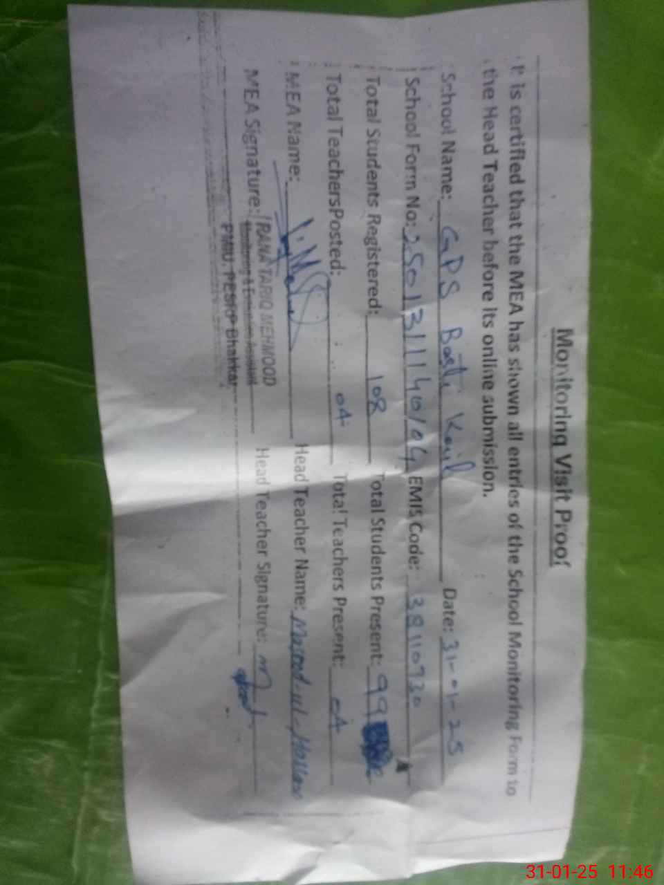 | Attendance Register | Head Teacher | MEA with School | Visit Proof |