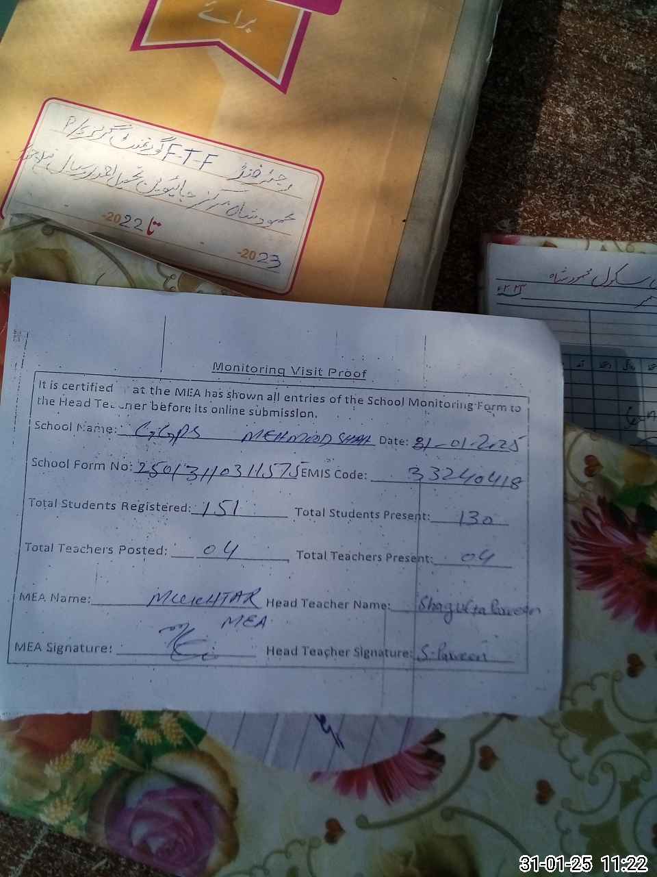 | Attendance Register | Head Teacher | MEA with School | Visit Proof |