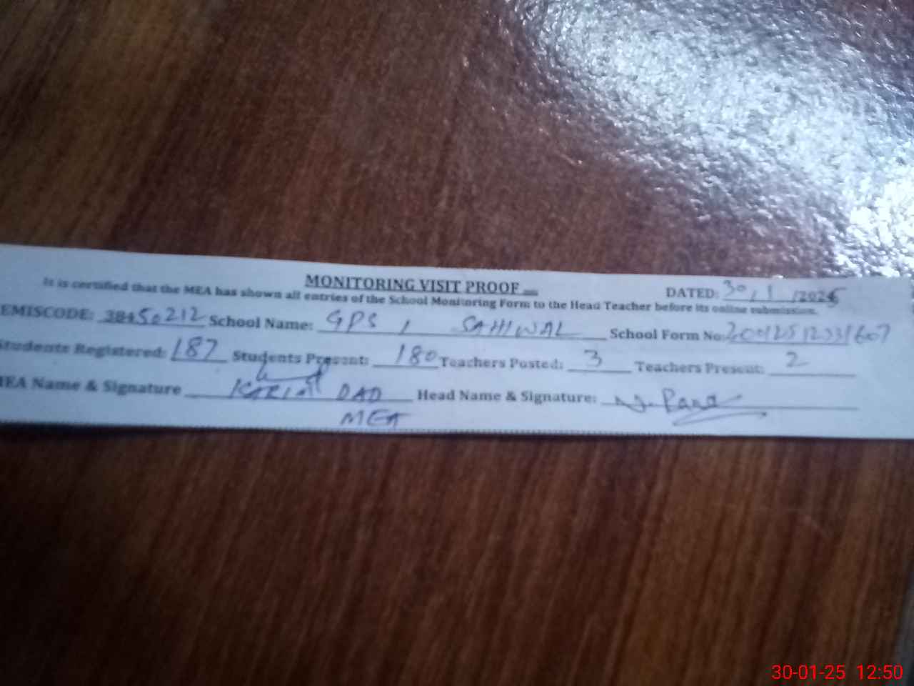 | Attendance Register | Head Teacher | MEA with School | Visit Proof |