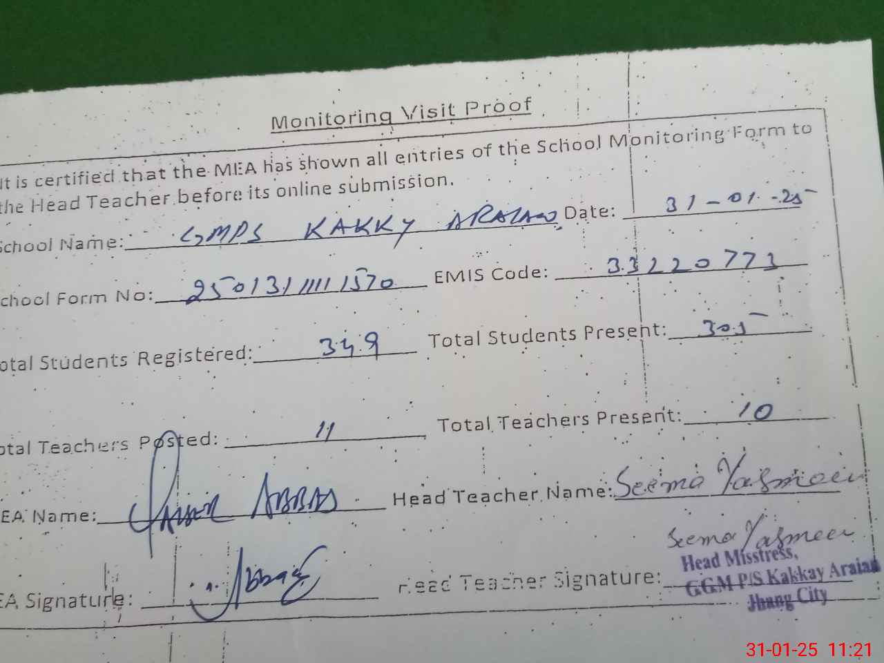 | Attendance Register | Head Teacher | MEA with School | Visit Proof |