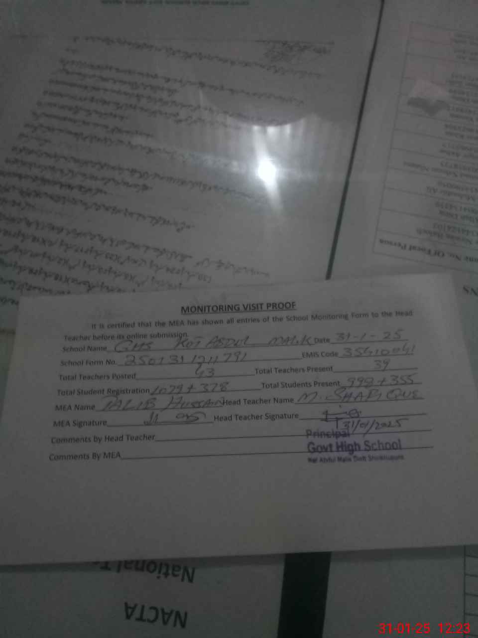 | Attendance Register | Head Teacher | MEA with School | Visit Proof |