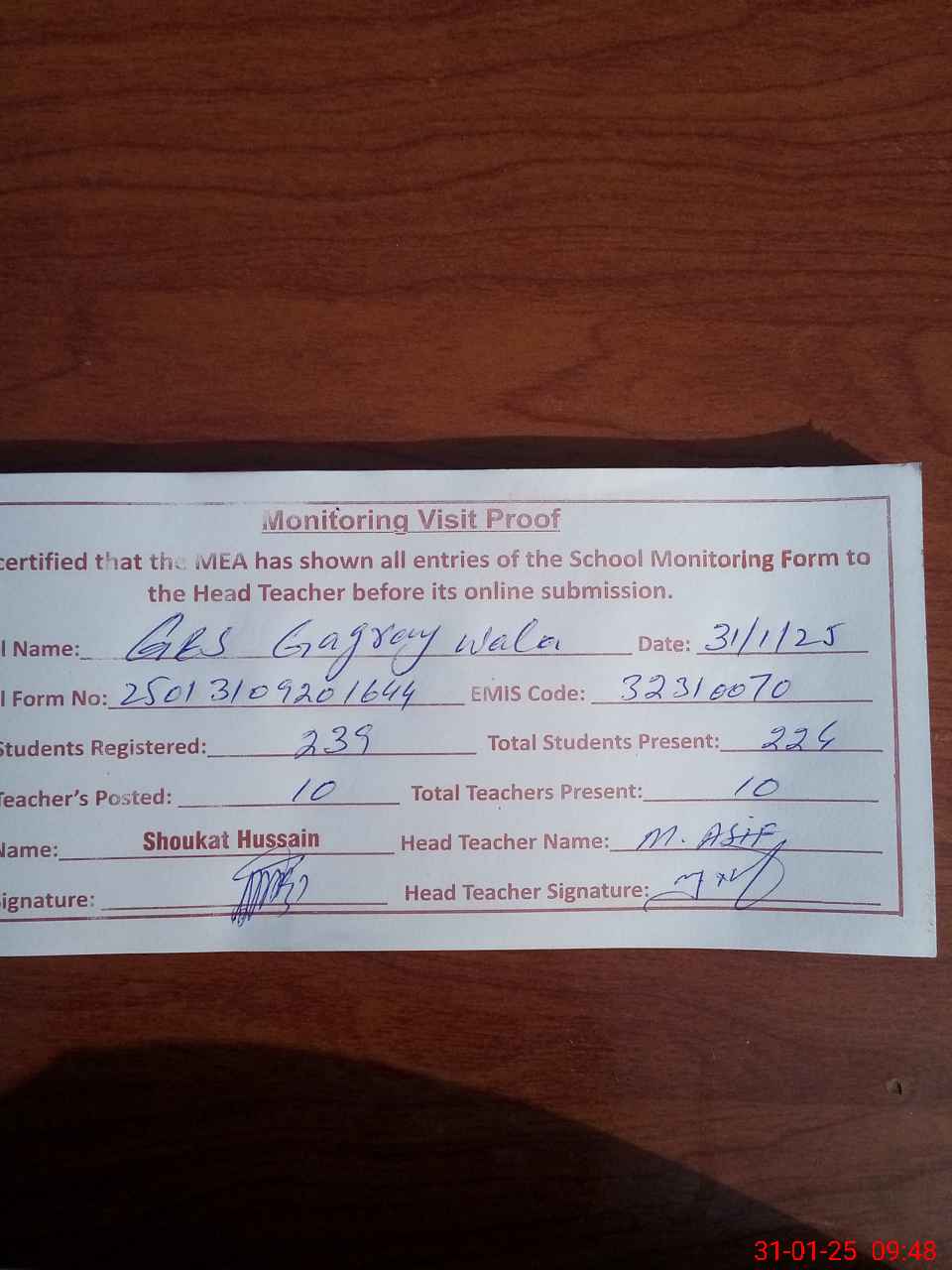 | Attendance Register | Head Teacher | MEA with School | Visit Proof |
