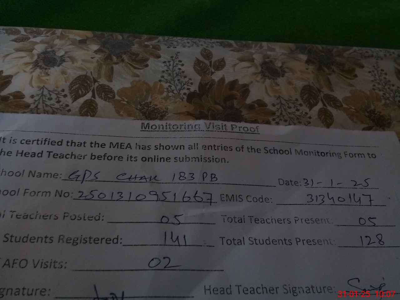 | EMIS Code: 31340147 | Name of School: GPS CHAK NO 183 PB | |||