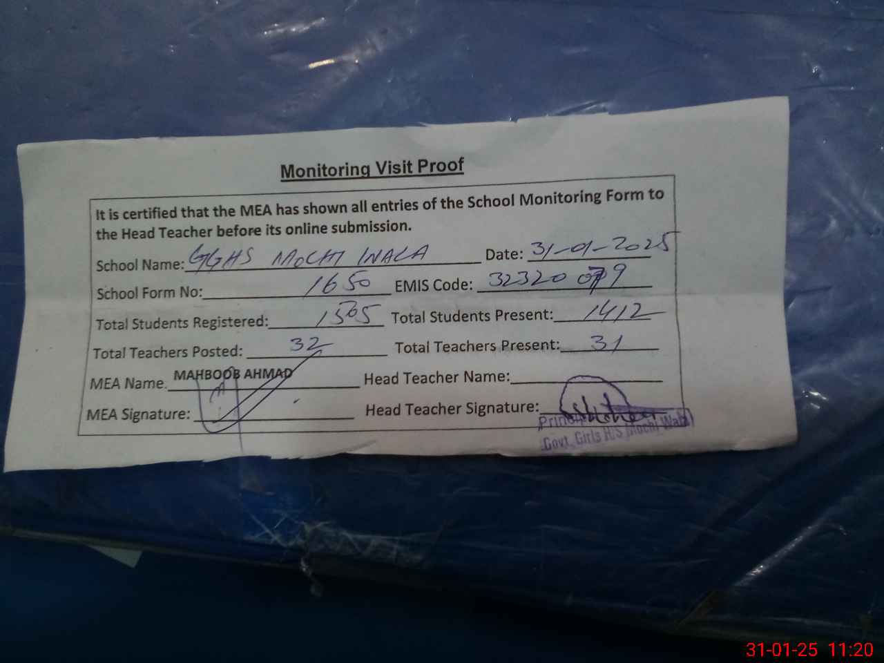 | EMIS Code: 32320079 | Name of School: GGHS MOCHI WALA | |||