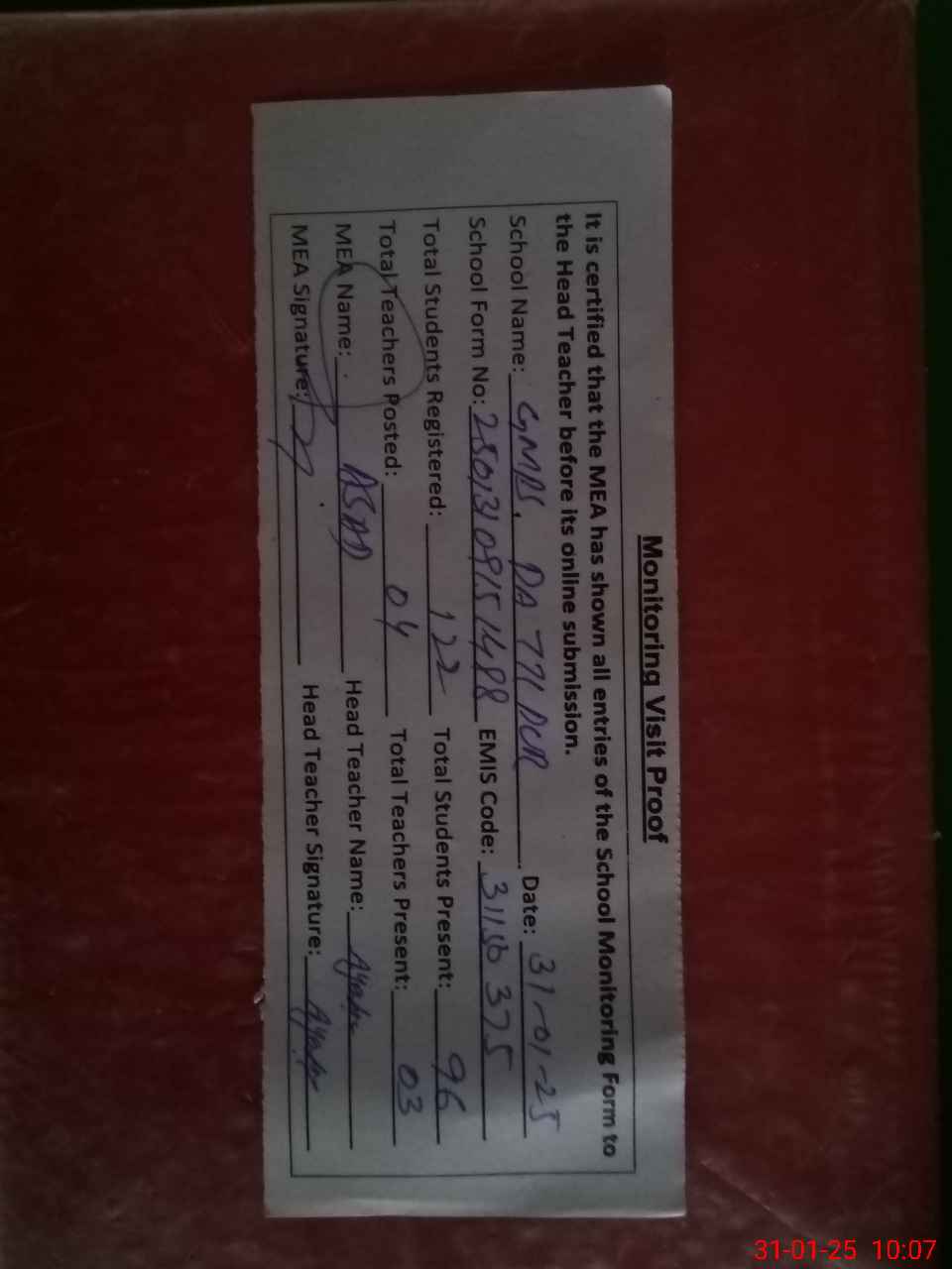 | Attendance Register | Head Teacher | MEA with School | Visit Proof |
