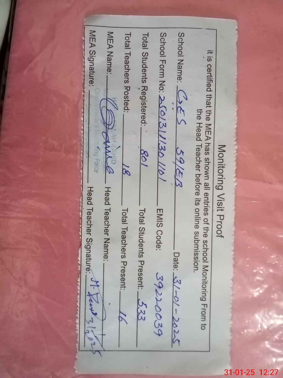 | Attendance Register | Head Teacher | MEA with School | Visit Proof |