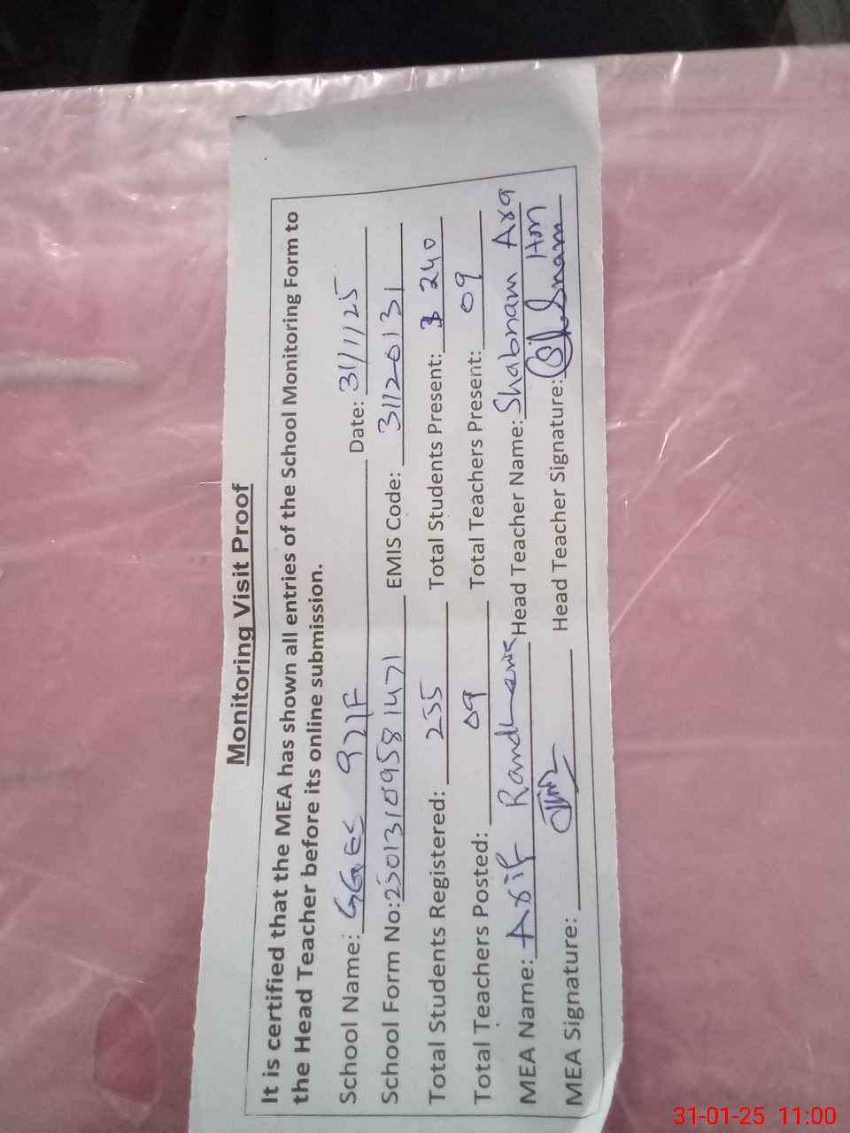 | Attendance Register | Head Teacher | MEA with School | Visit Proof |
