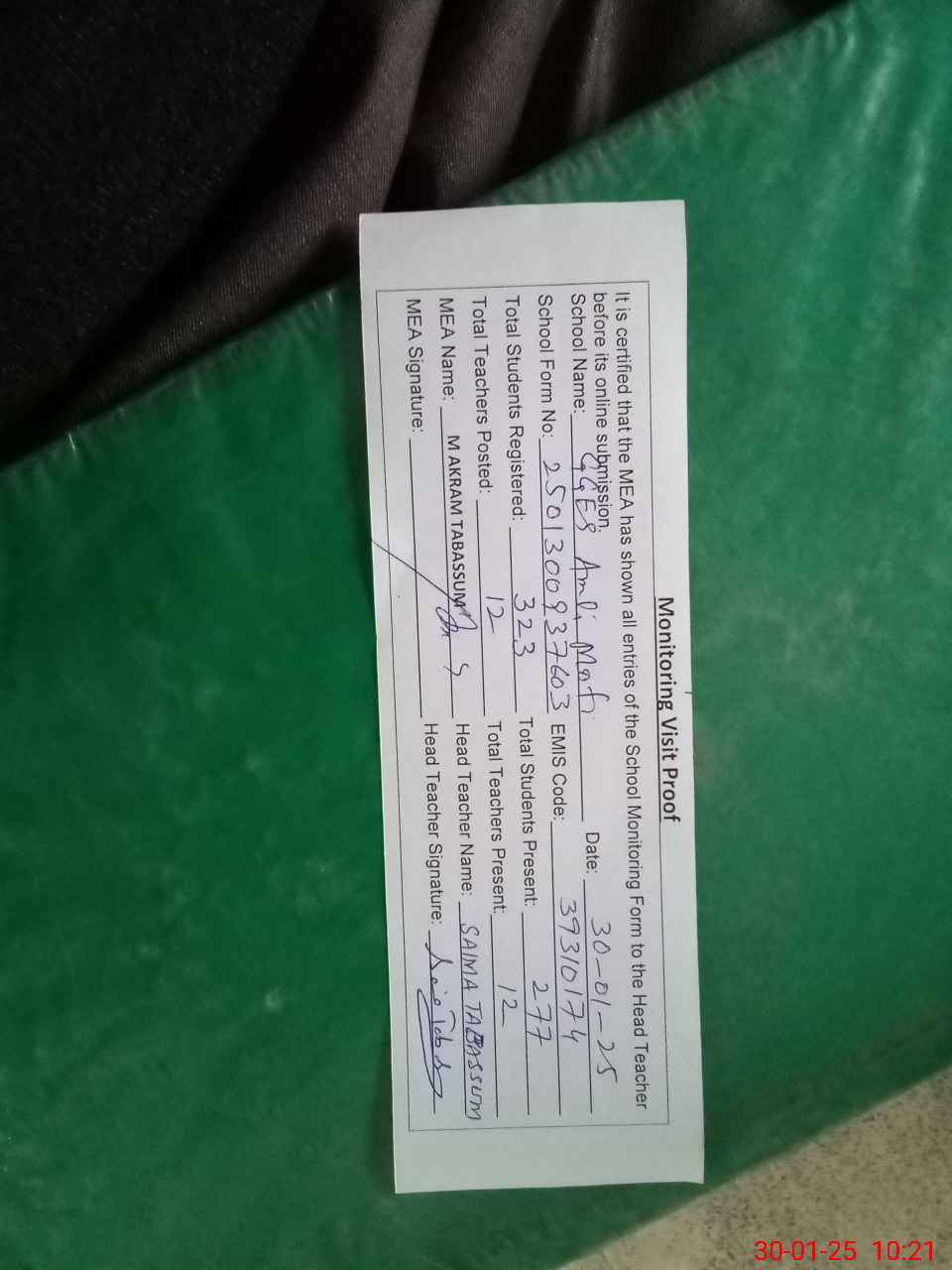 | Attendance Register | Head Teacher | MEA with School | Visit Proof |