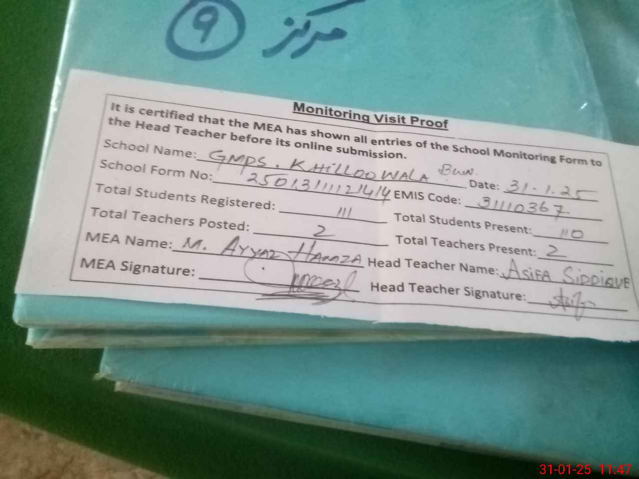 | Attendance Register | Head Teacher | MEA with School | Visit Proof |