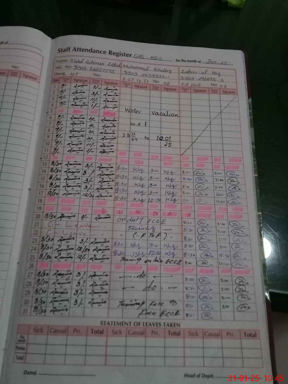 | CNIC | Full Name | Designation | R/C | Absence During Last Calender Month |