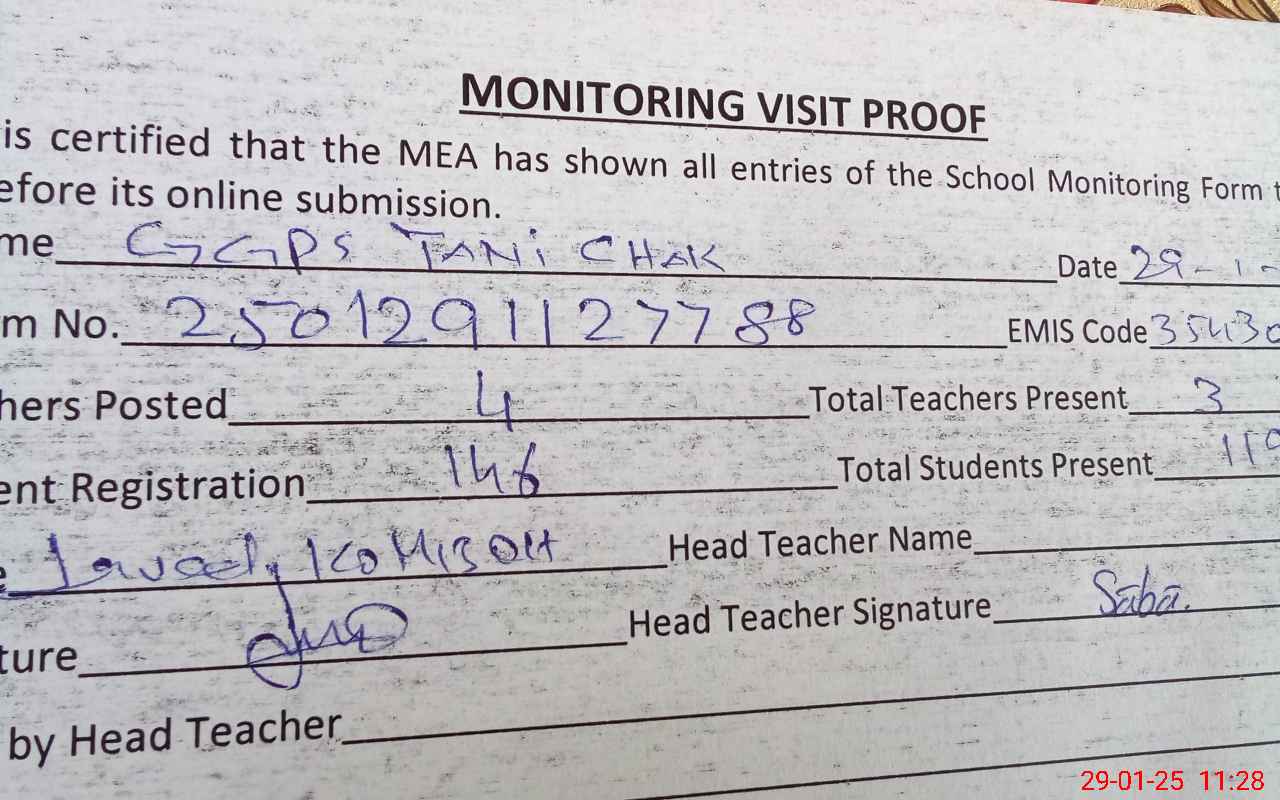 | EMIS Code: 35430955 | Name of School: GGPS TANI CHAK 524 CHACHI KOTHI | |||