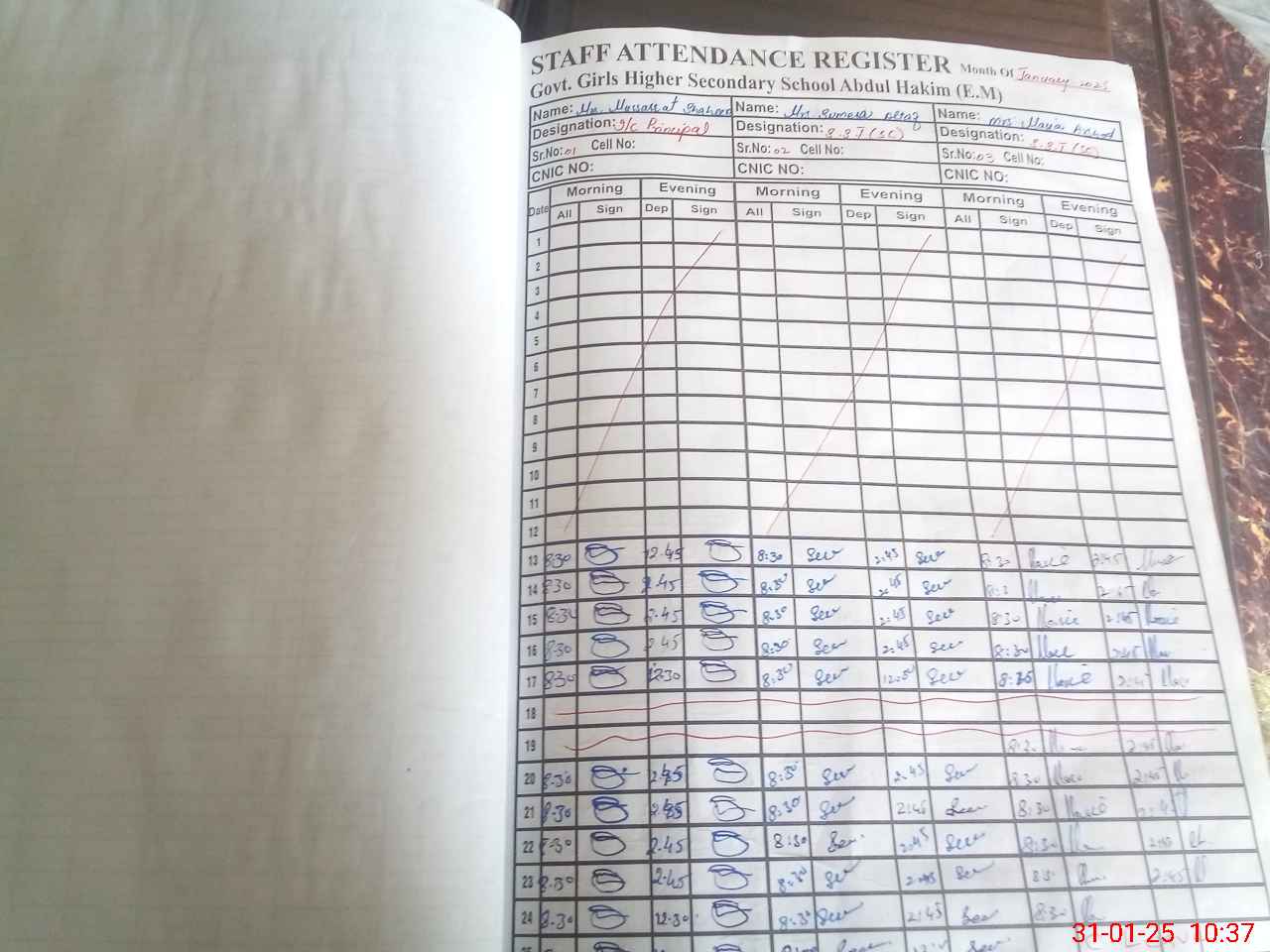 | CNIC | Full Name | Designation | R/C | Absence during last cal. month |