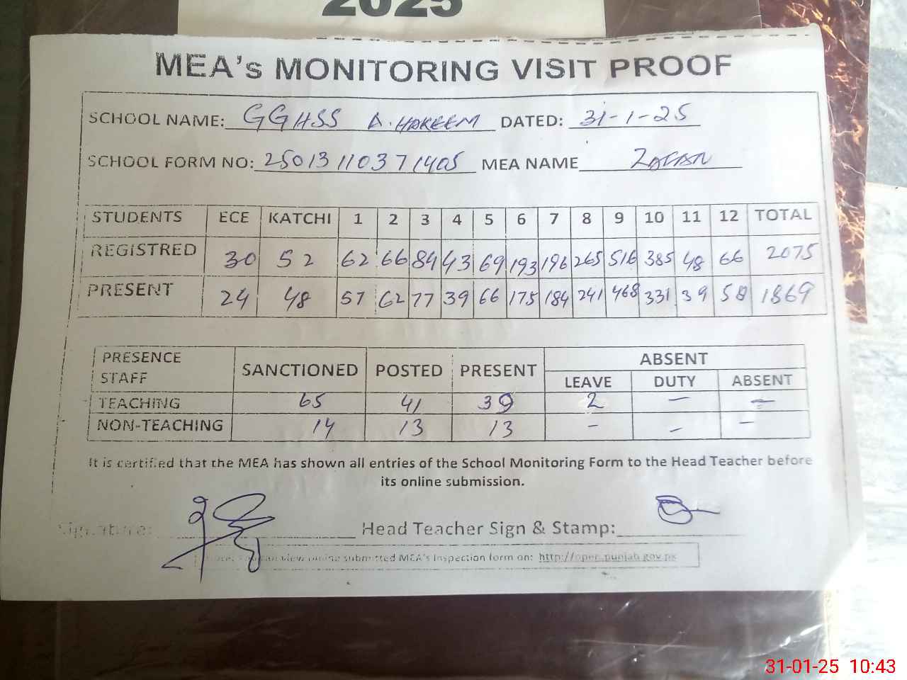 | Attendance Register | Head Teacher | MEA with School | Visit Proof |