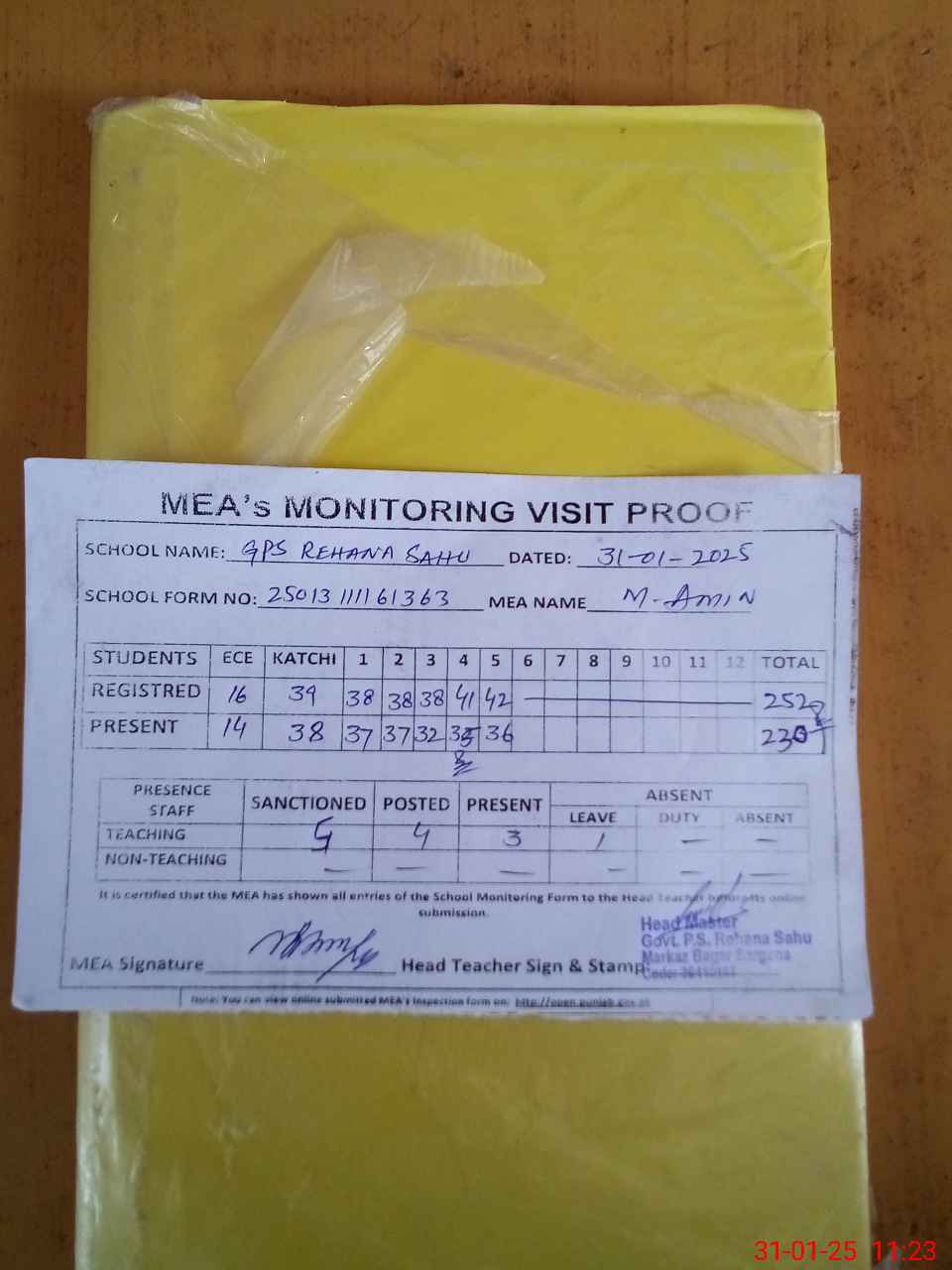 | Attendance Register | Head Teacher | MEA with School | Visit Proof |