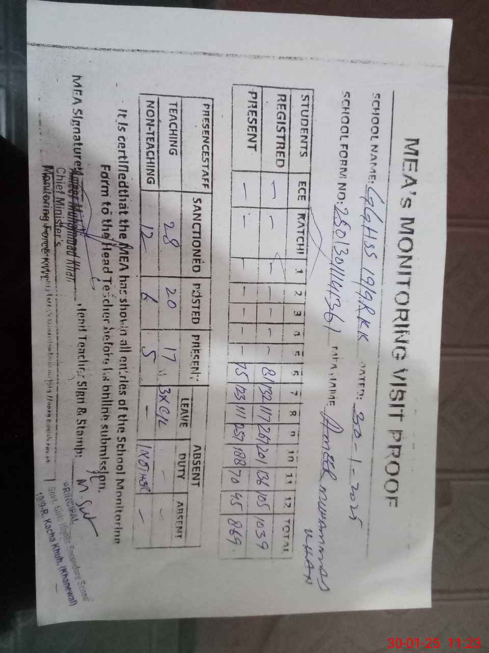 | Attendance Register | Head Teacher | MEA with School | Visit Proof |