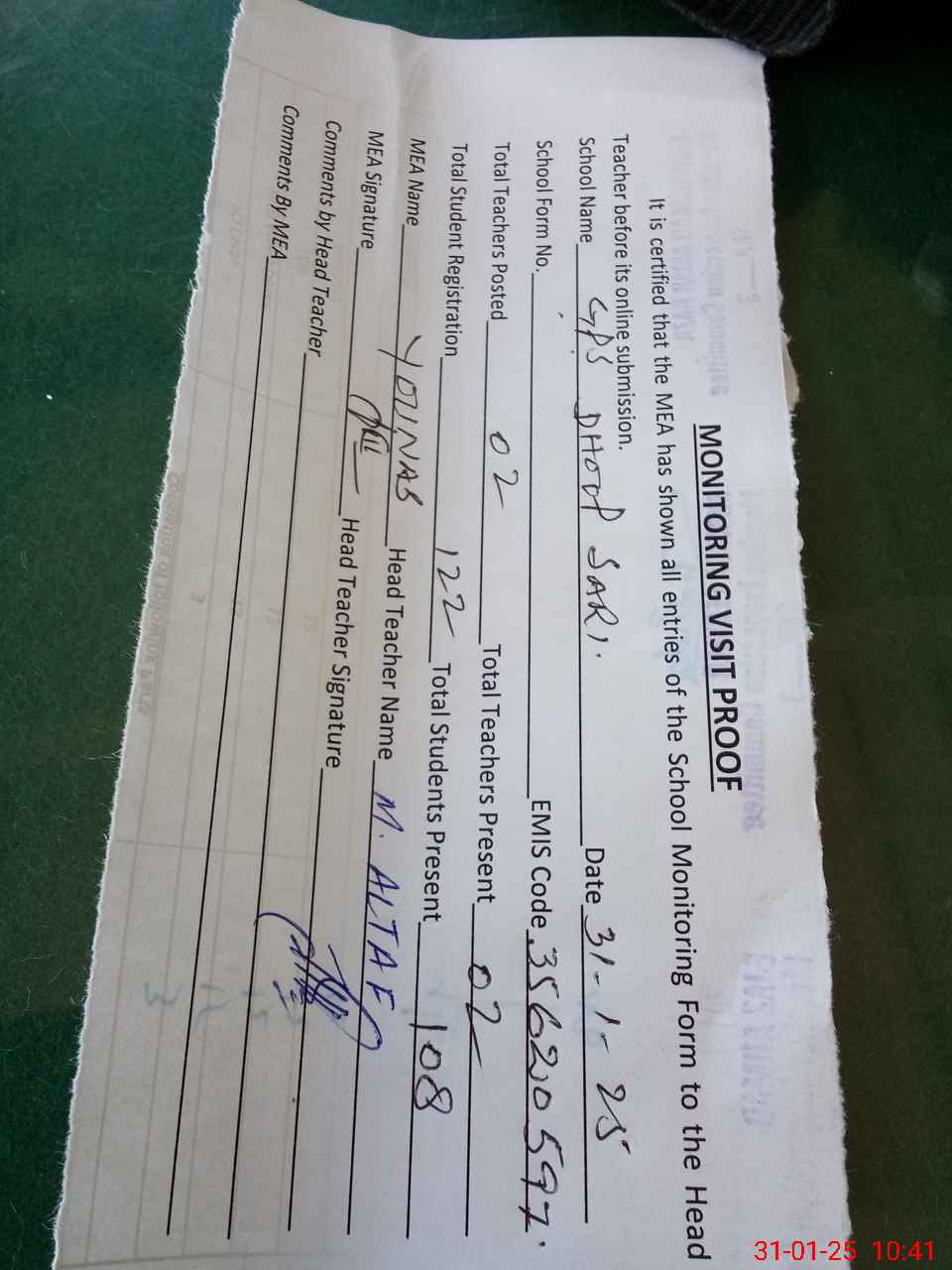 | Attendance Register | Head Teacher | MEA with School | Visit Proof |