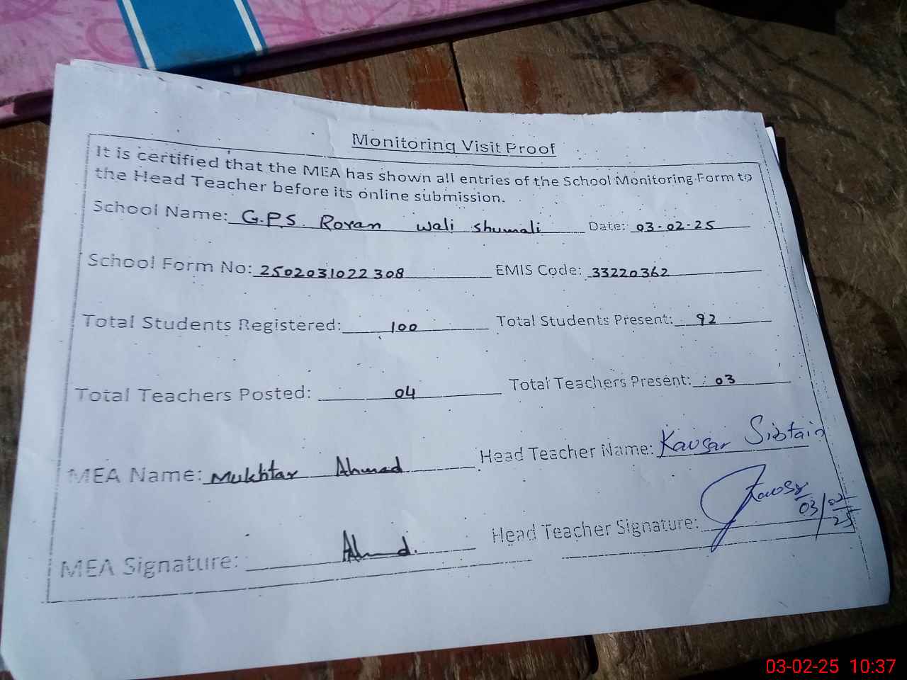 | EMIS Code: 33220362 | Name of School: GPS RORAN WALI SHUMALI | |||