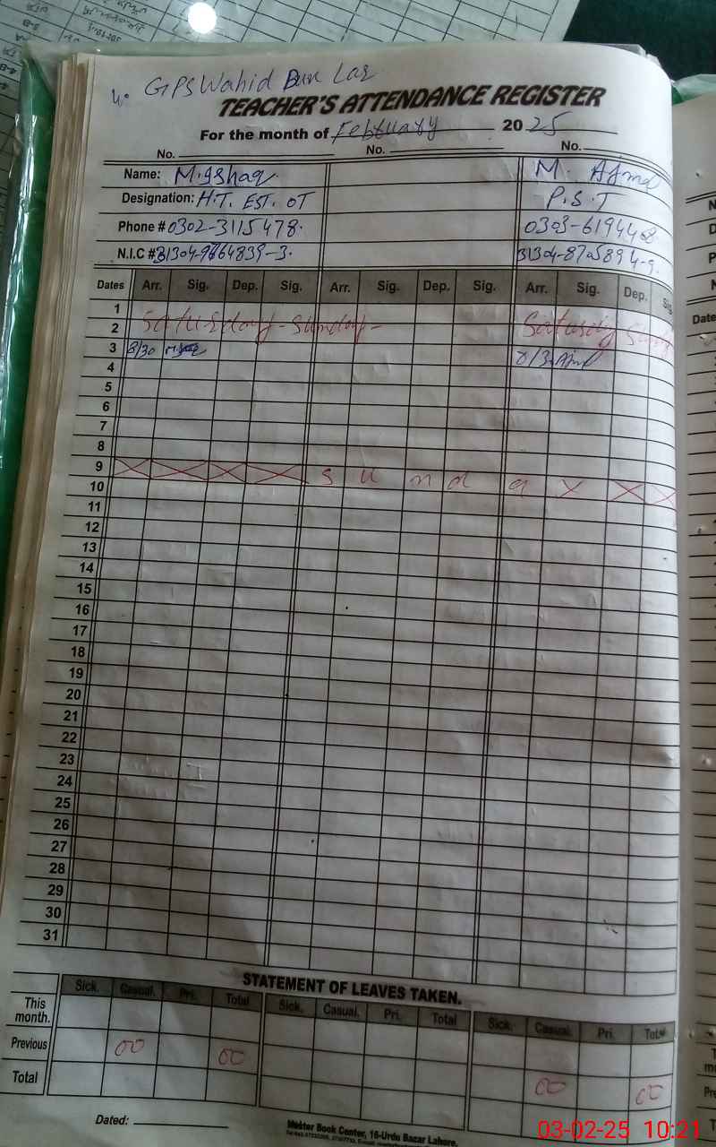 | EMIS Code: 31340143 | Name of School: GPS WAHID BUX LAR | |||