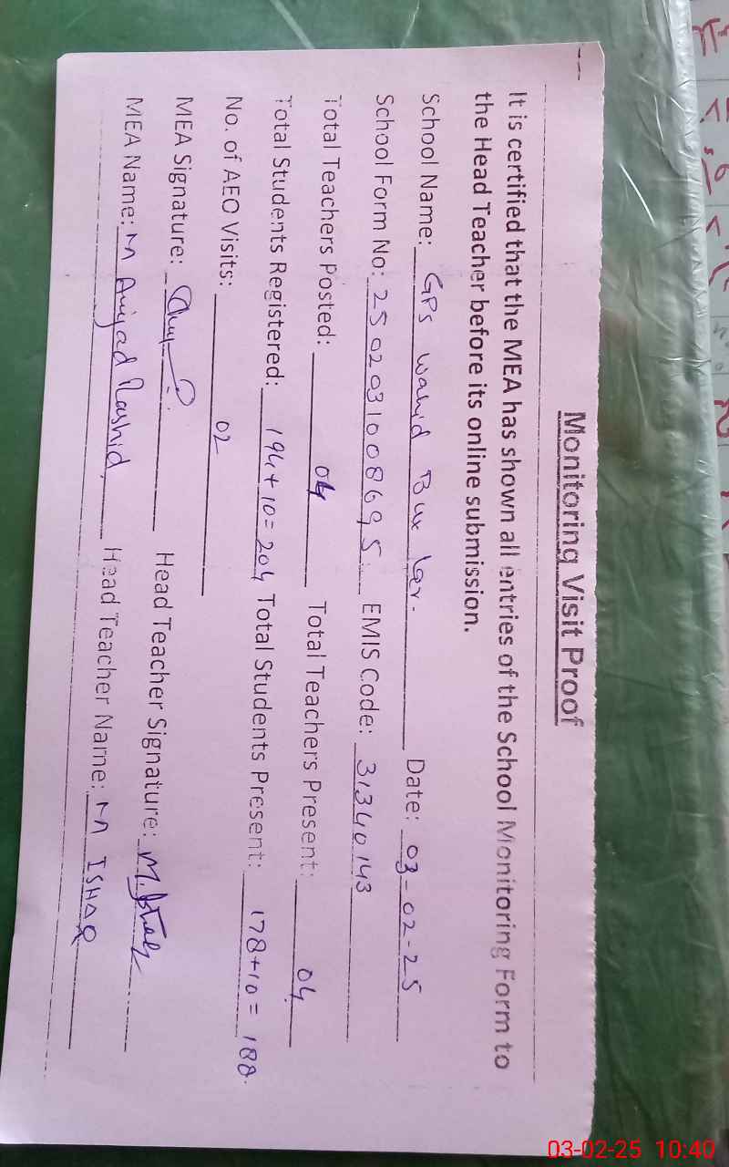 | Certified that this School was Inspected by the Undersigned MEA/DMO Today and the Information Stated Above is as Per Record. | |||||