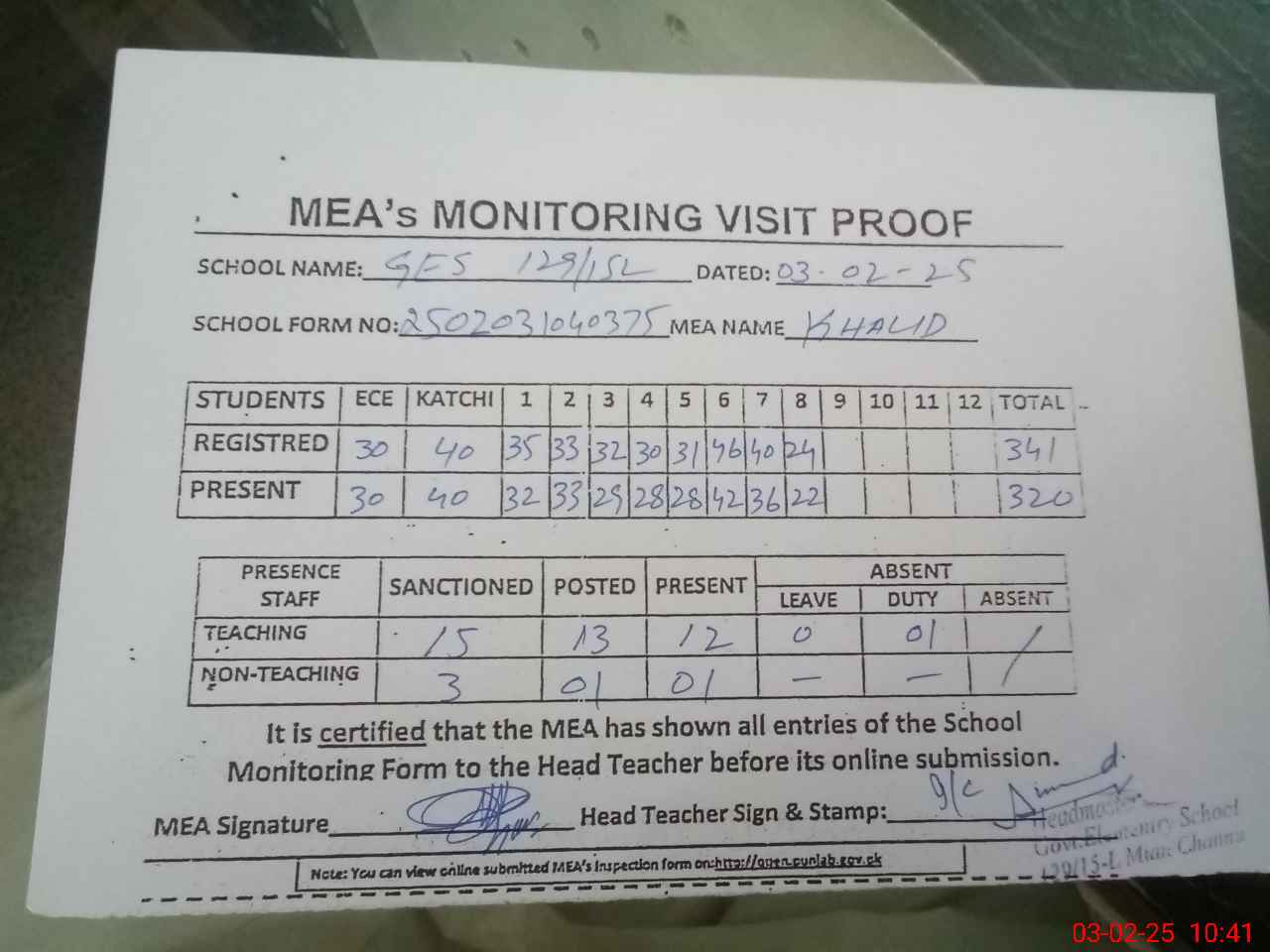 | EMIS Code: 36430201 | Name of School: GES 129/15-L, MIAN CHANNU | |||