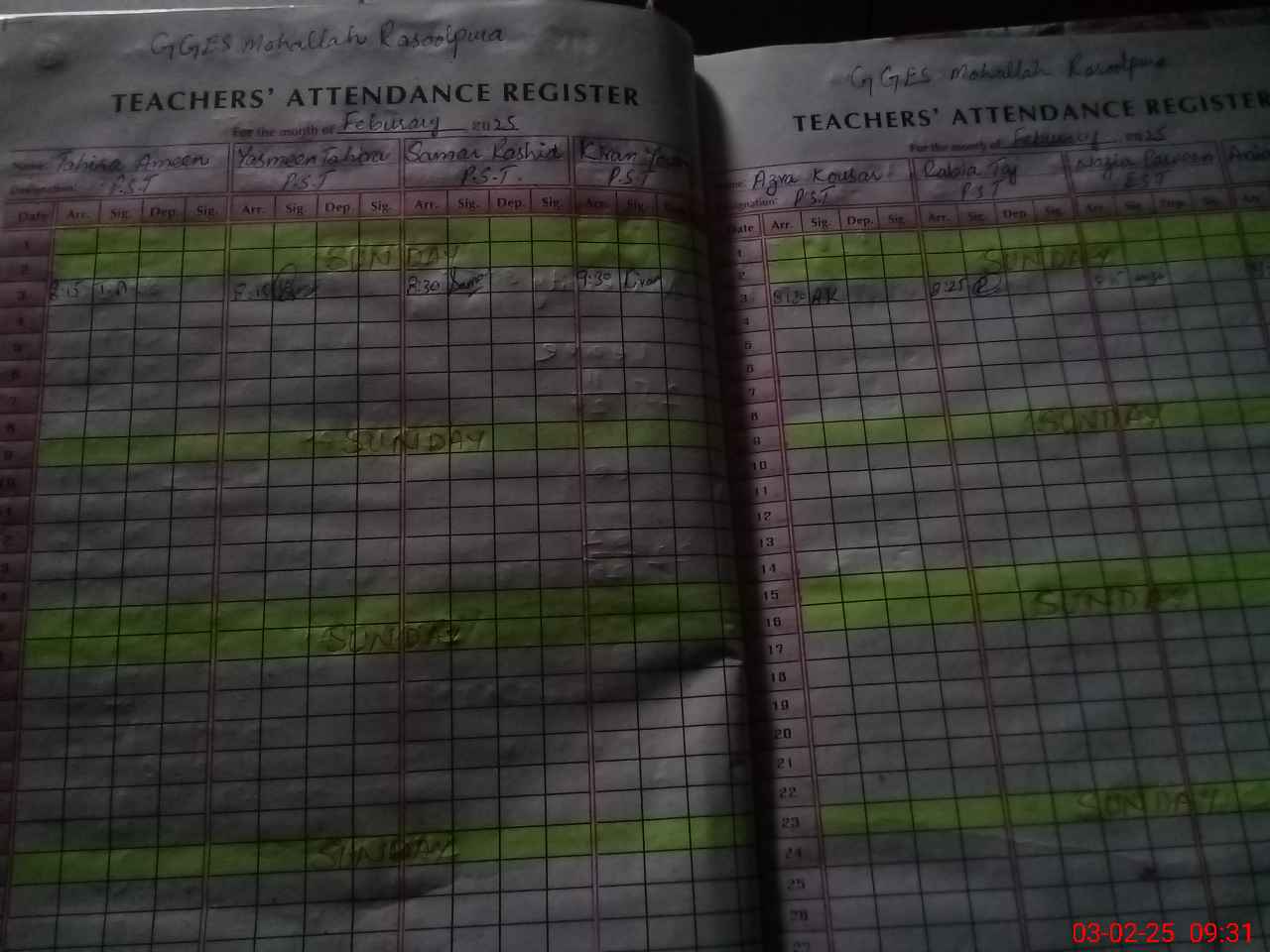 | No. of Students Present - Female | 25 | 0 | 50 | 54 | 50 | 36 | 36 | 49 | 0 | 0 | 0 | 300 | ||||