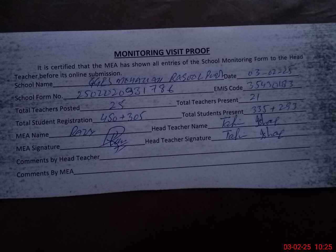 | Attendance Register | Head Teacher | MEA with School | Visit Proof |