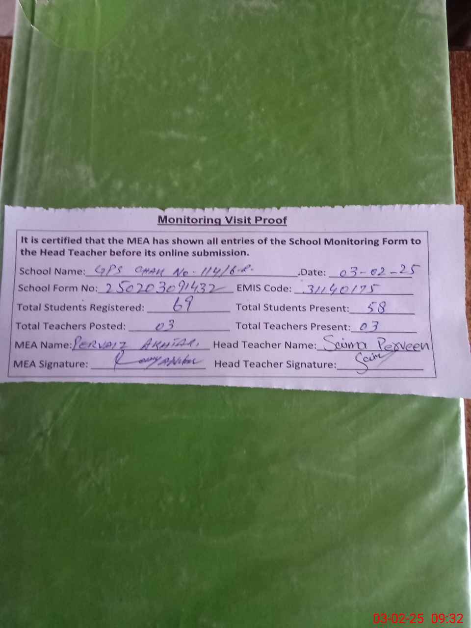 | Attendance Register | Head Teacher | MEA with School | Visit Proof |