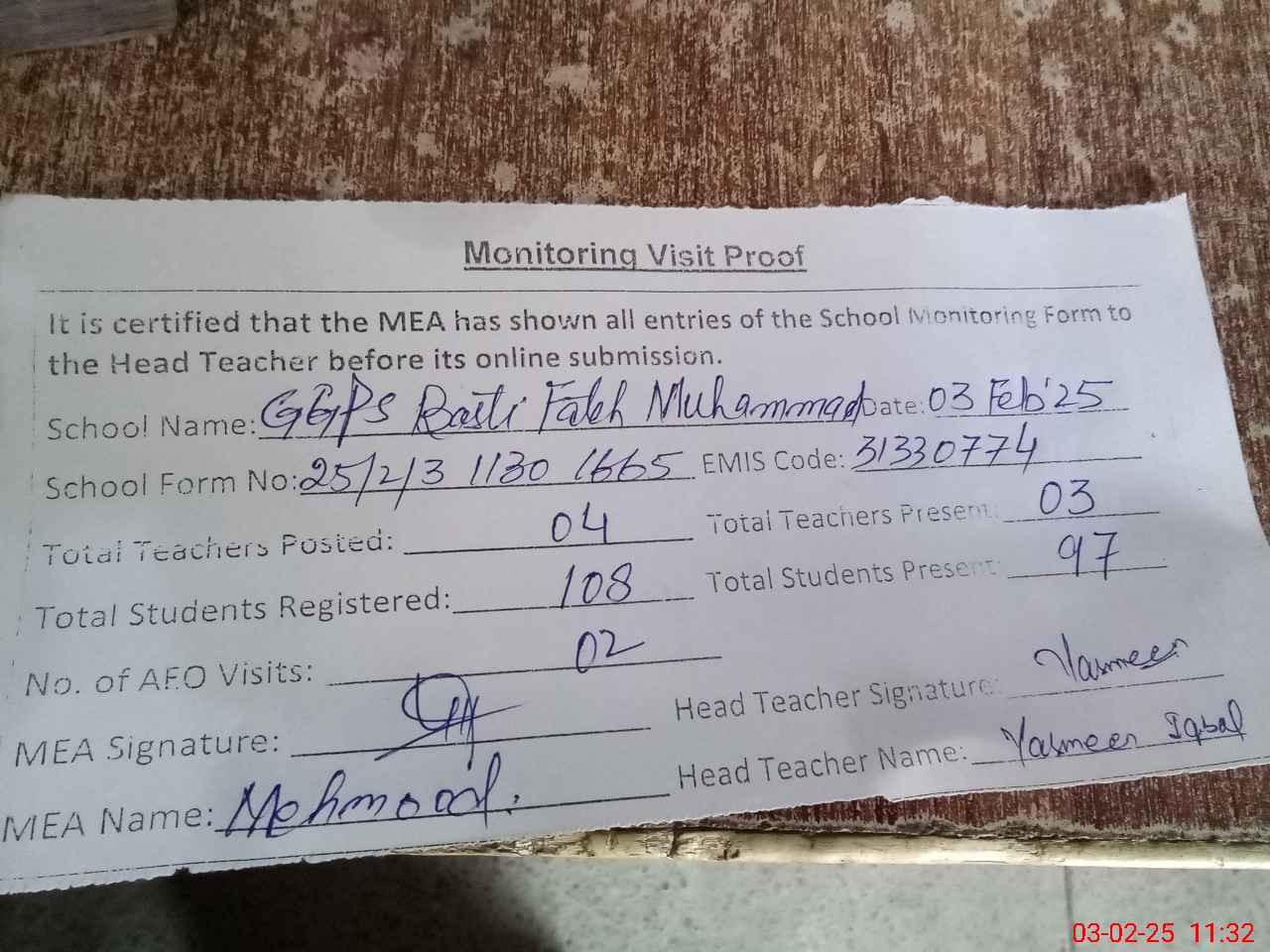 | Attendance Register | Head Teacher | MEA with School | Visit Proof |