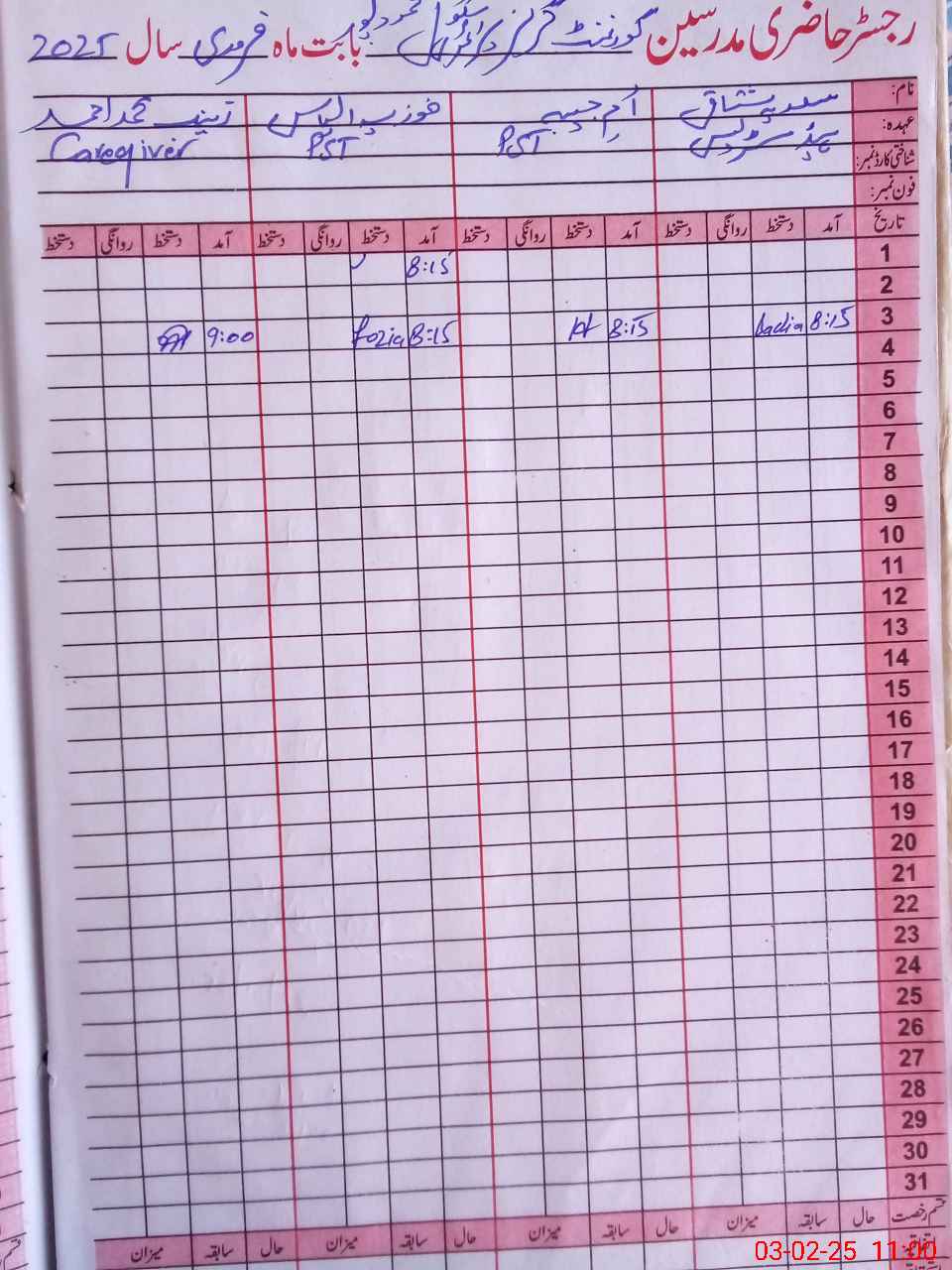 | CNIC | Full Name | Designation | R/C | Absence During Last Calender Month |