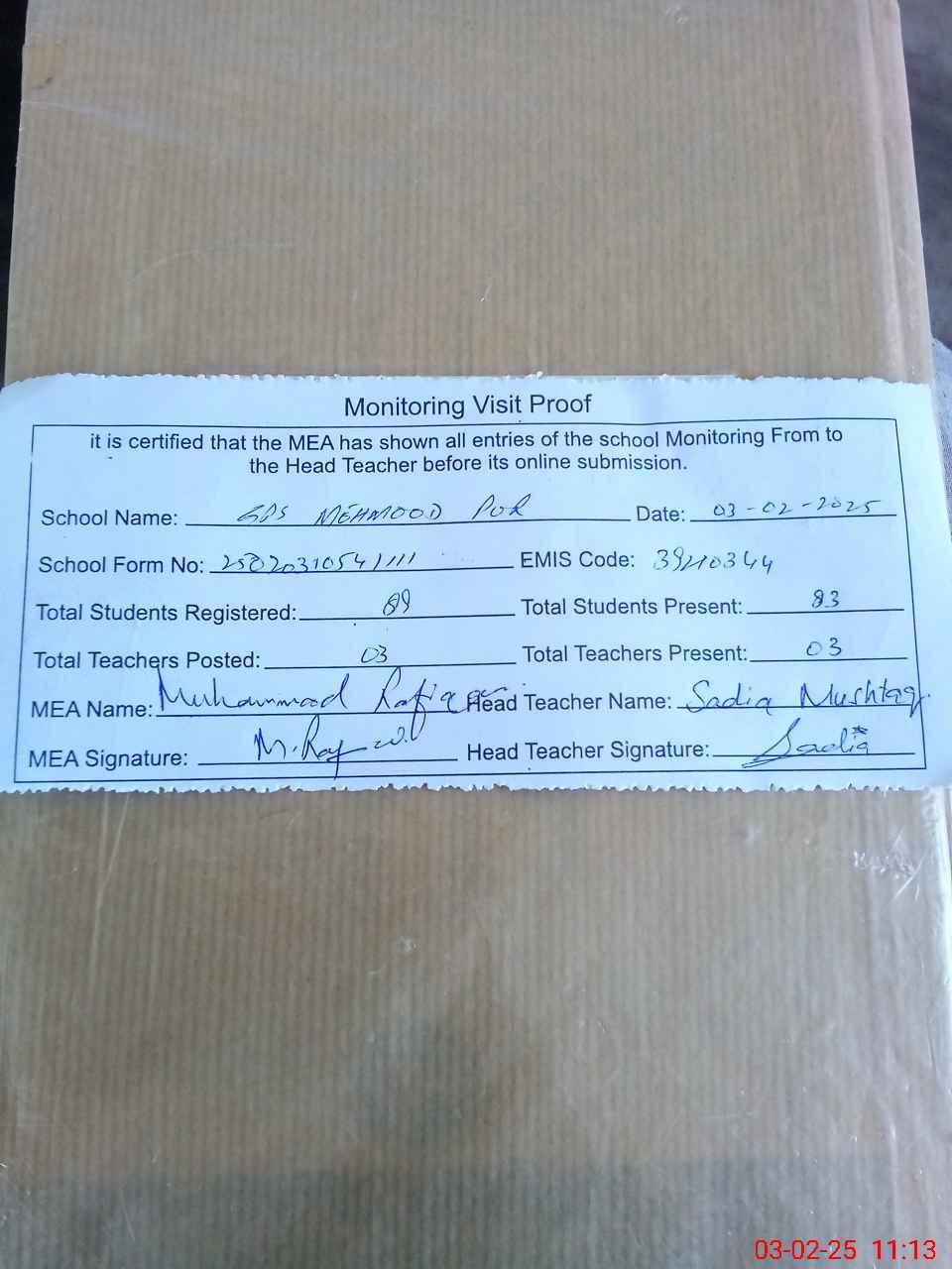 | Attendance Register | Head Teacher | MEA with School | Visit Proof |