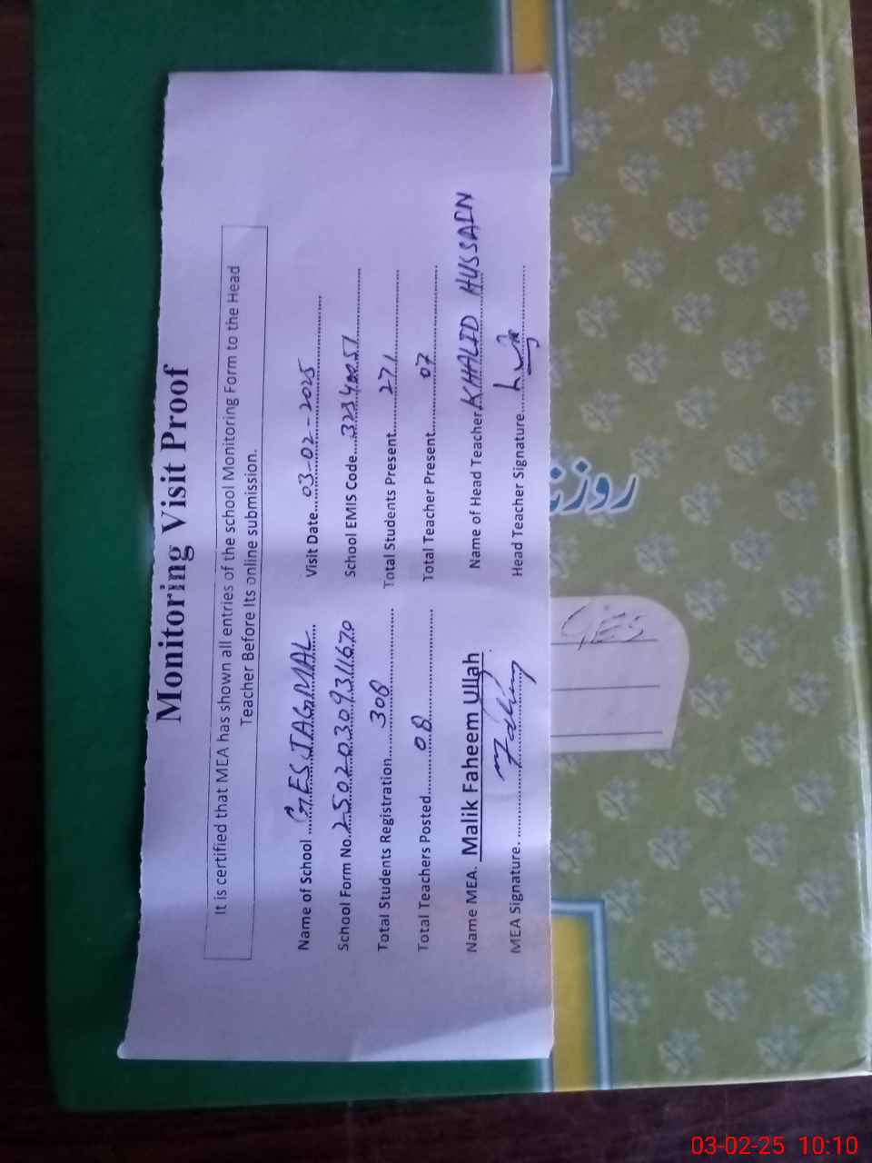 | Attendance Register | Head Teacher | MEA with School | Visit Proof |