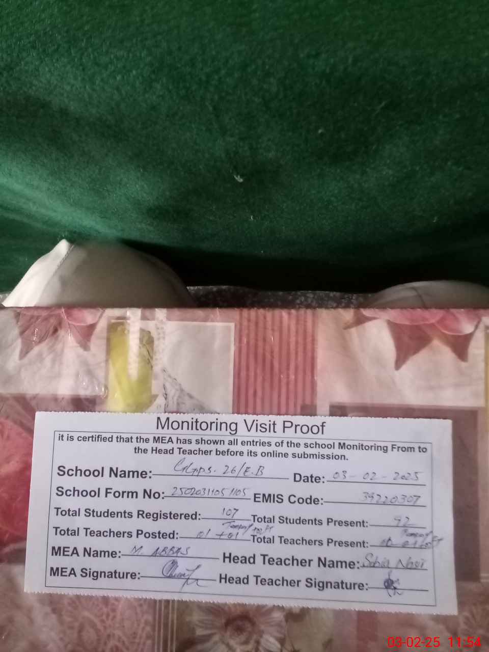| Attendance Register | Head Teacher | MEA with School | Visit Proof |