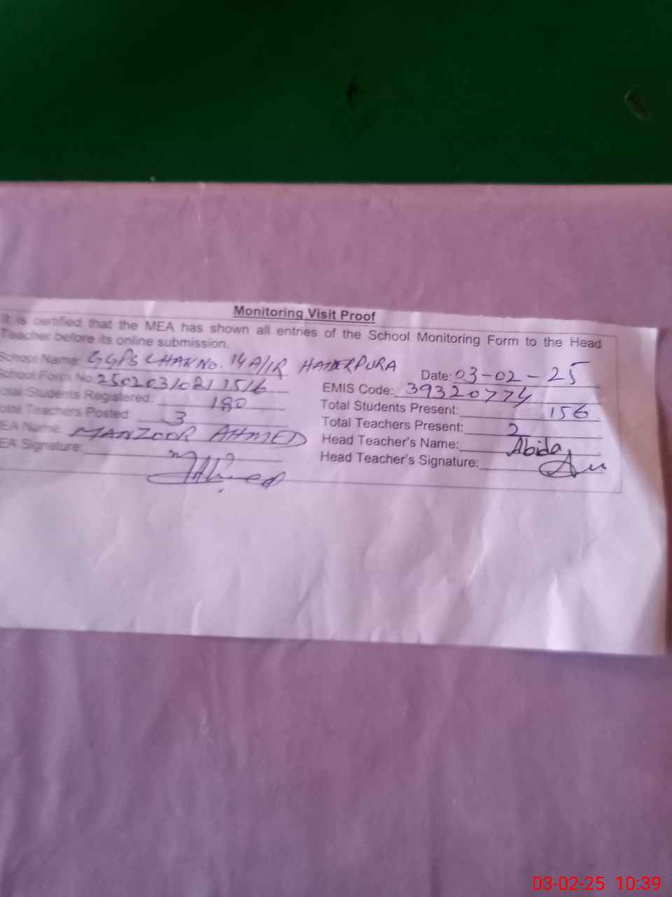| Monitoring Date: 03-02-2025 | Start Time: 03-02-2025 10:21 AM | End Time: 03-02-2025 10:40 AM | Name of MEA: MA**** AH**** | |