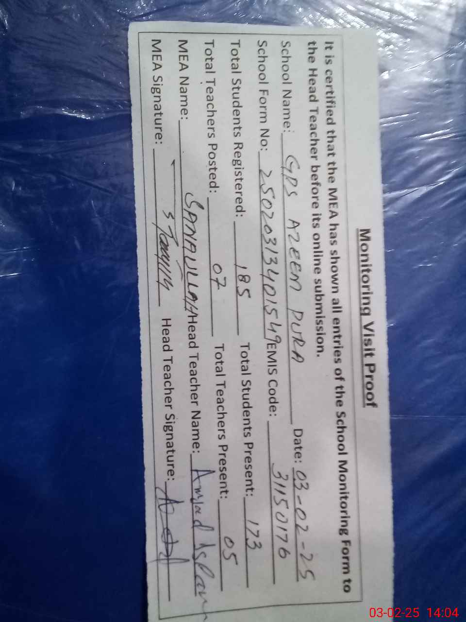 | EMIS Code: 31150176 | Name of School: GPS AZEEM PURA | |||