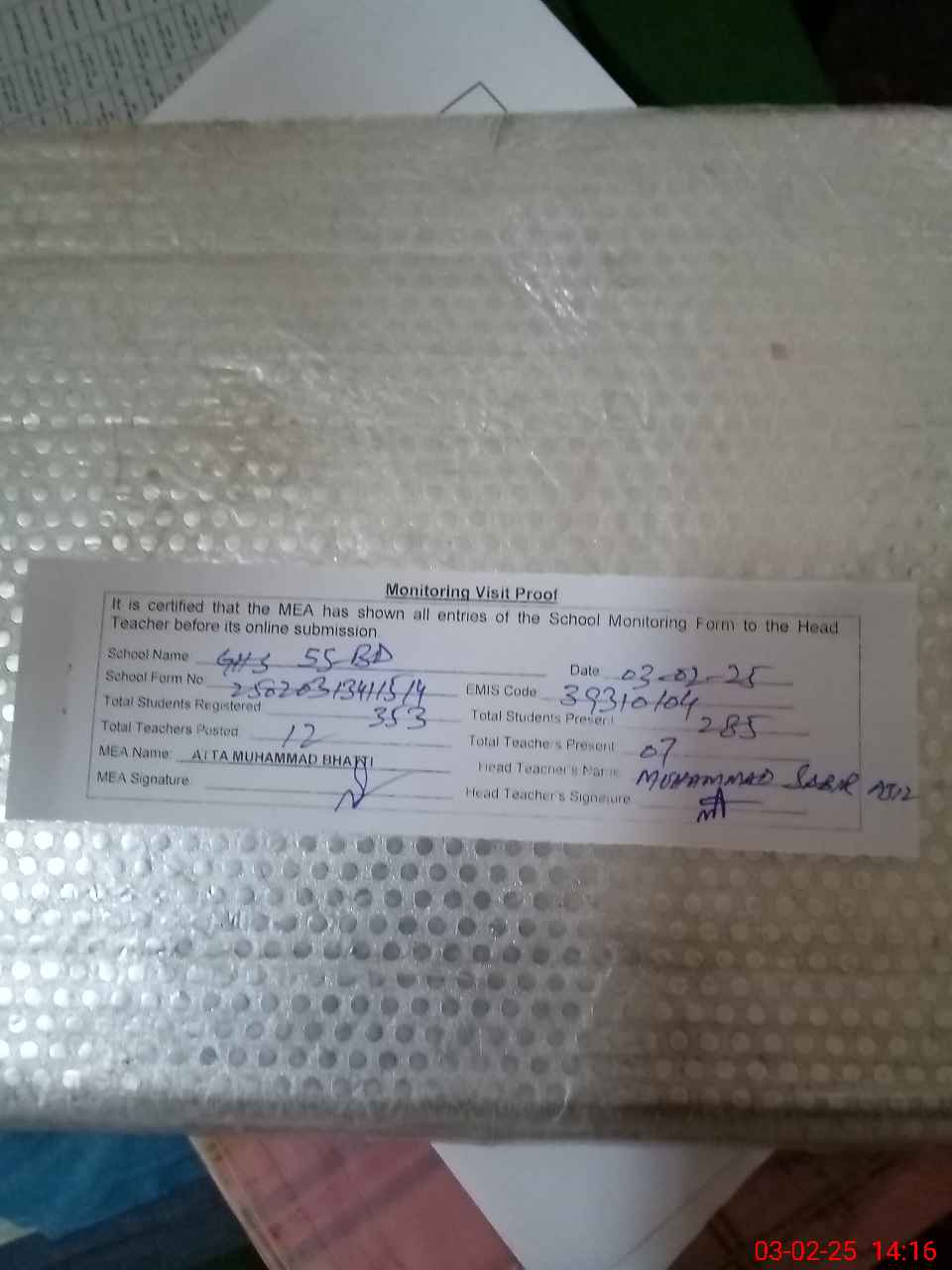 | EMIS Code: 39310104 | Name of School: GHS CHAK NO. 55/BD | |||