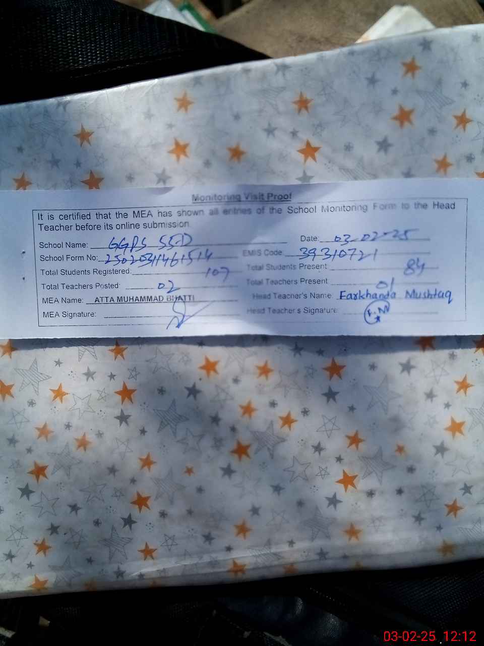 | Attendance Register | Head Teacher | MEA with School | Visit Proof |