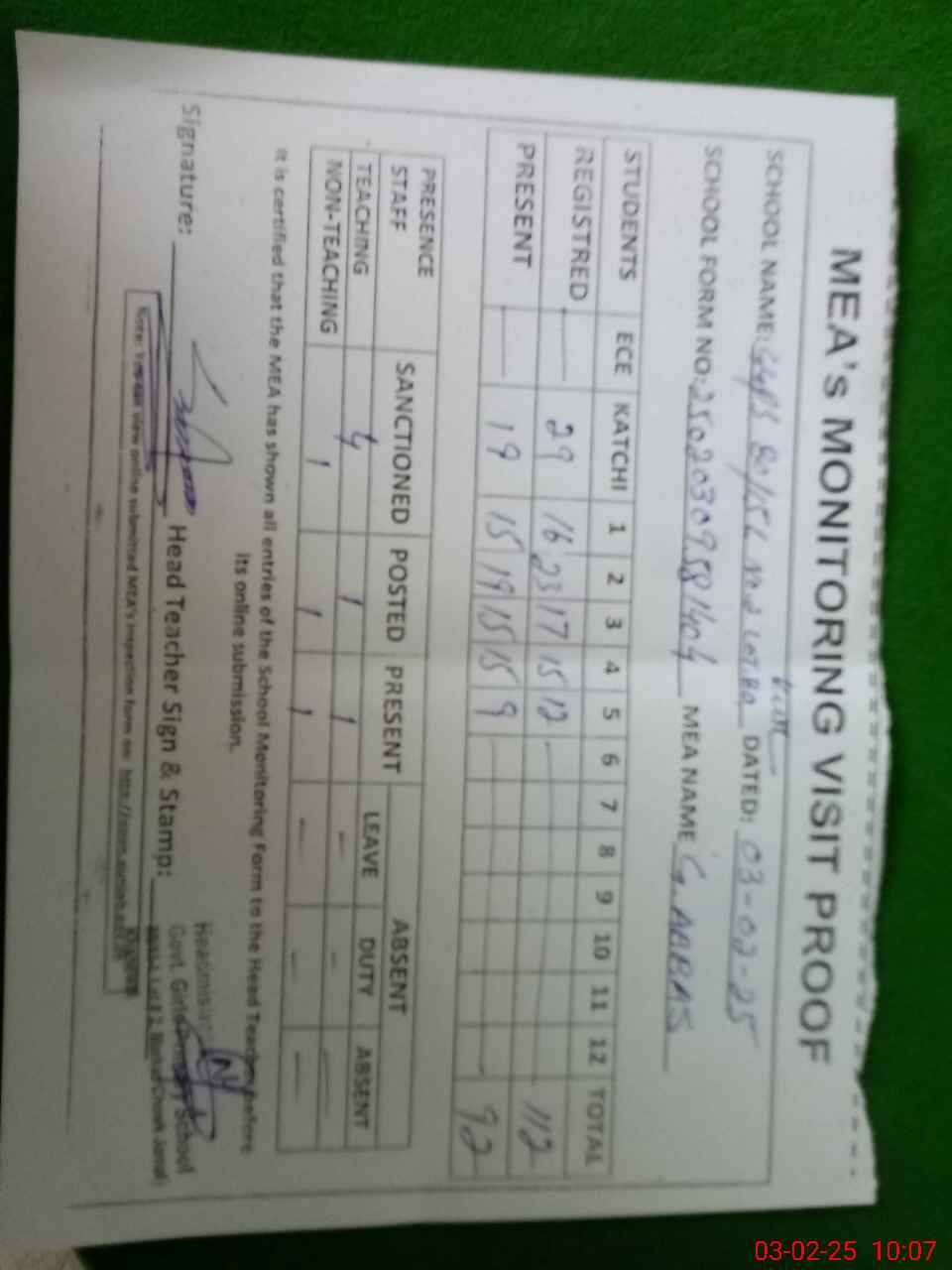 | Attendance Register | Head Teacher | MEA with School | Visit Proof |