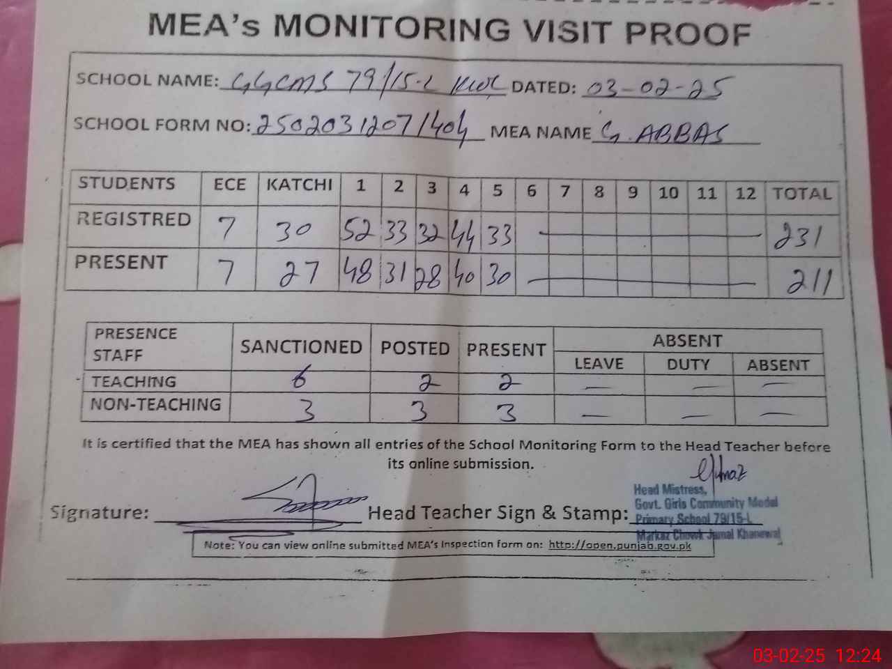 | Attendance Register | Head Teacher | MEA with School | Visit Proof |