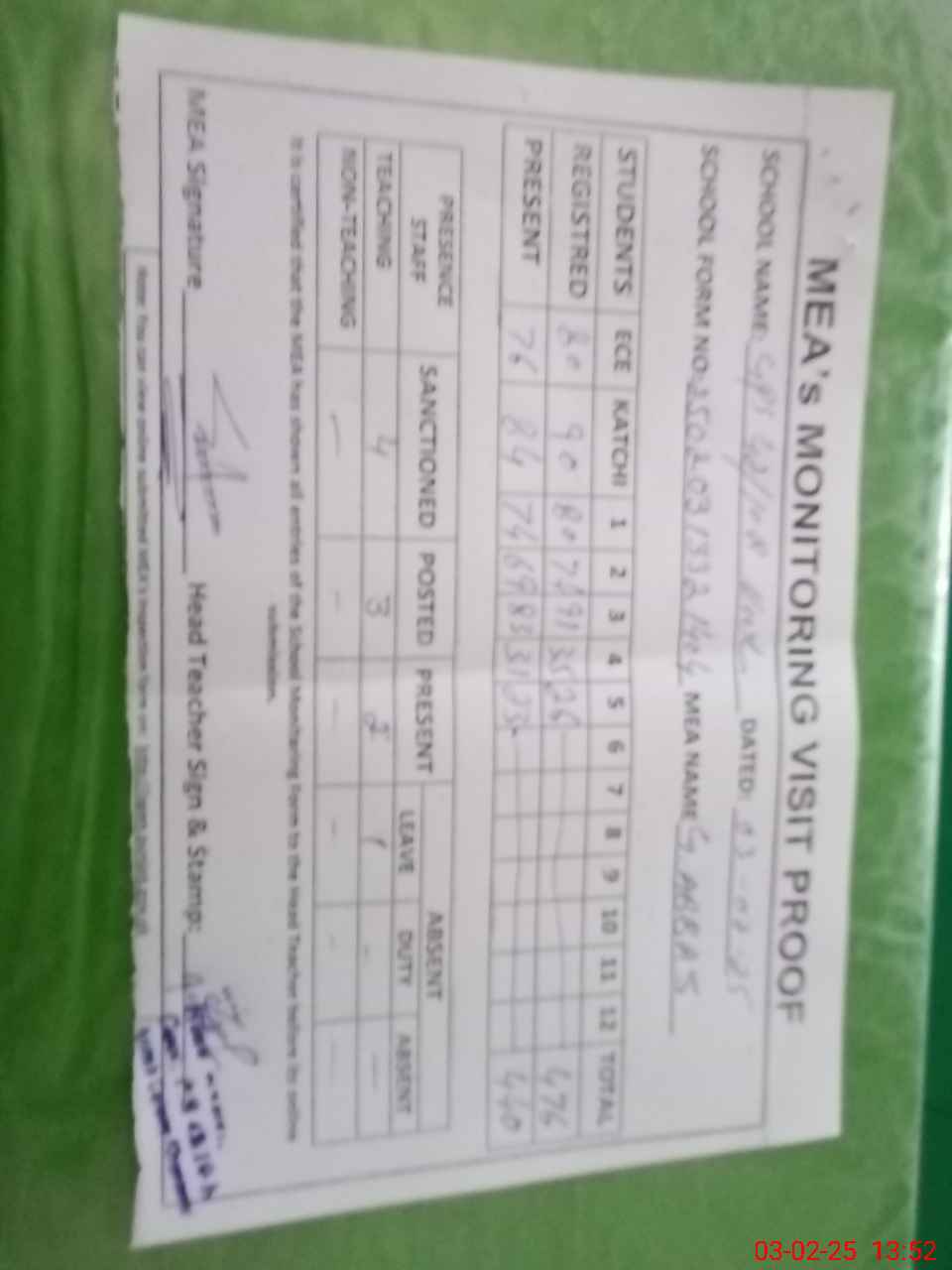 | Attendance Register | Head Teacher | MEA with School | Visit Proof |