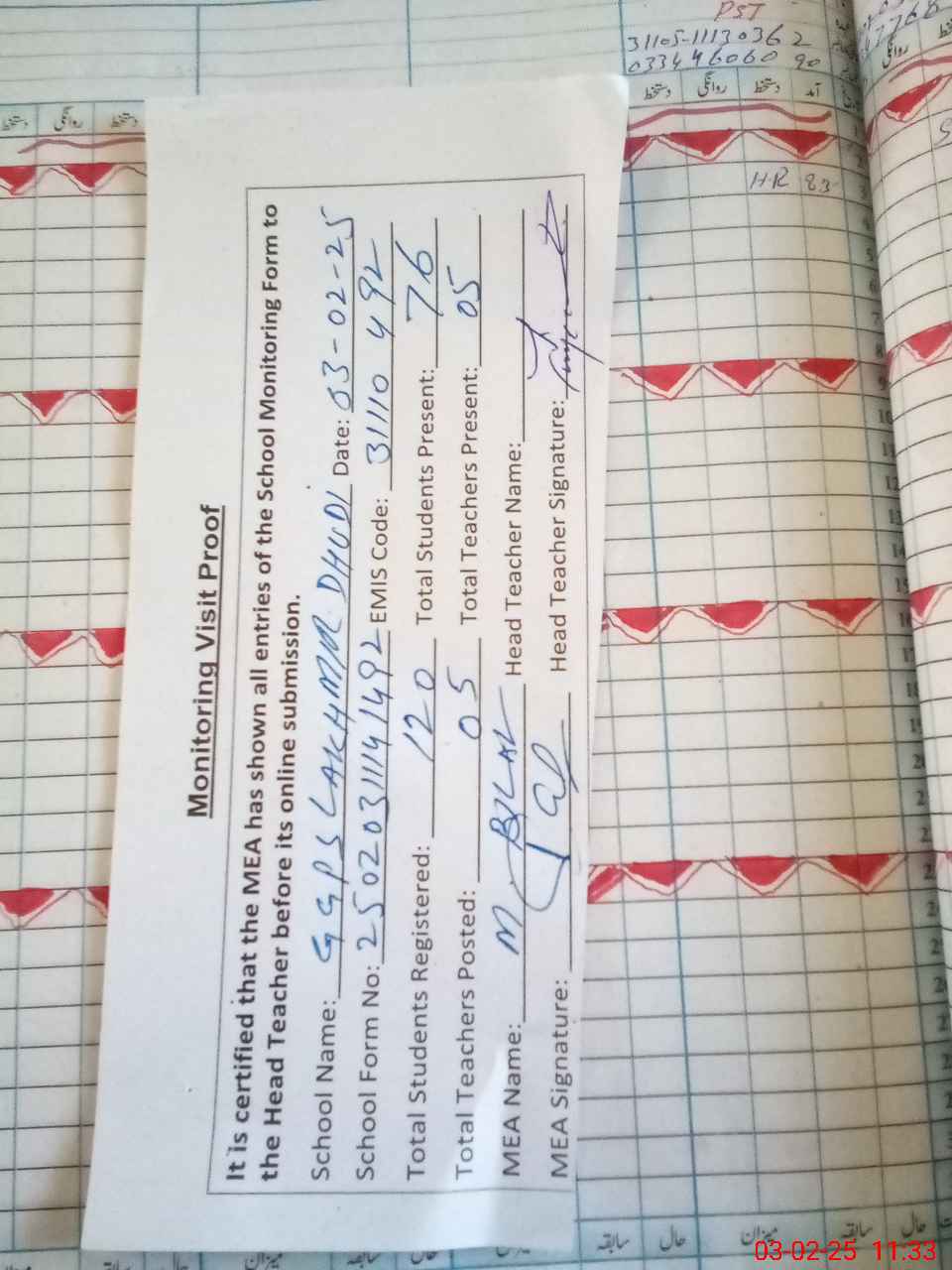 | Attendance Register | Head Teacher | MEA with School | Visit Proof |