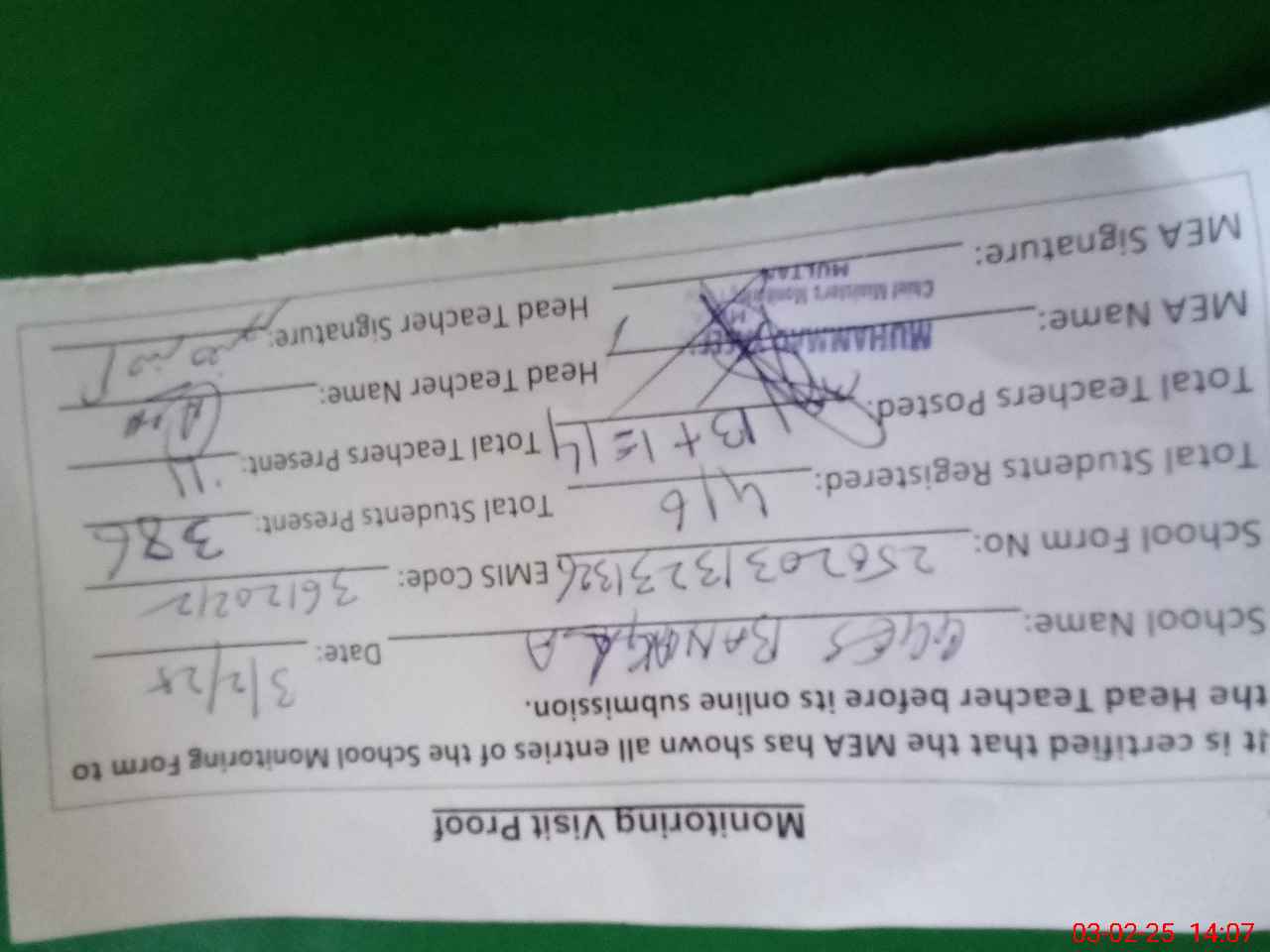 | Certified that this School was Inspected by the Undersigned MEA/DMO Today and the Information Stated Above is as Per Record. | |||||